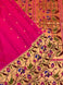 This organza saree showcases an all-over floral embroidery design with a leheriya pattern on the body. It is complemented by a self-printed border and pallu, all in a stunning turquoise-blue color. The contrasting blouse is made of tussore fabric and features a floral print.