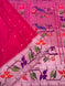 This rani-pink Paithani silk saree features intricate handwoven details, including gold zari polka dots on the body, self resham weave floral veins, and motifs of parrots and peacocks on the border and pallu. The accompanying blouse is designed with a self plain pattern and border.
