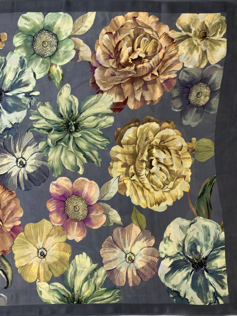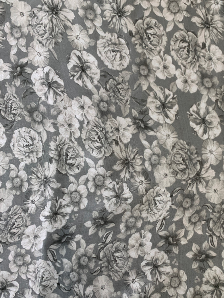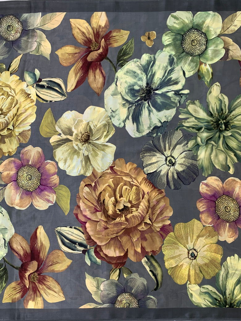 This grey satin saree features an all over big floral Printed, complete with a contrast plain border and pallu. The saree also includes a self floral Printed blouse to complete the look.