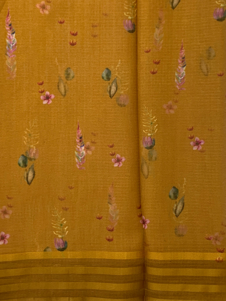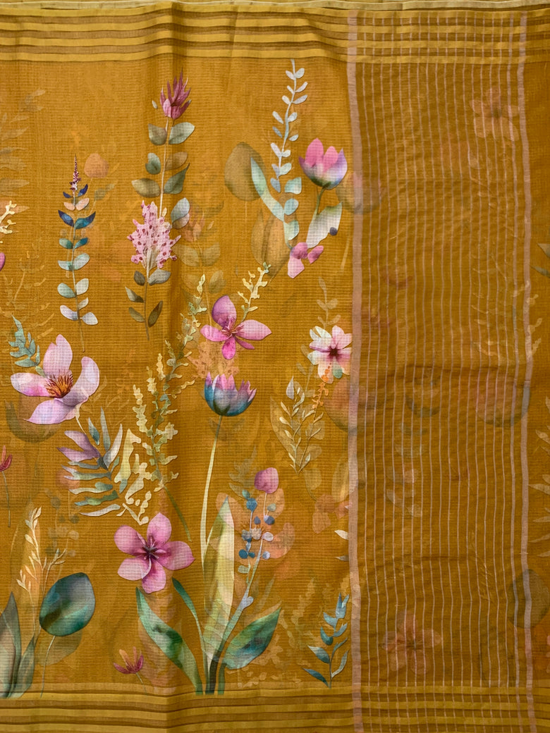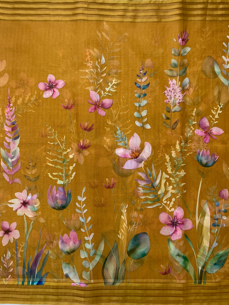 Silk Kota Floral Printed Saree Mustard In Colour