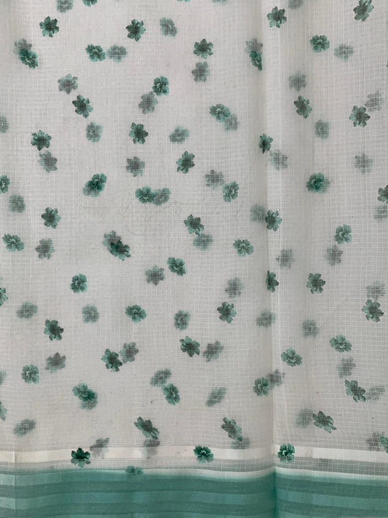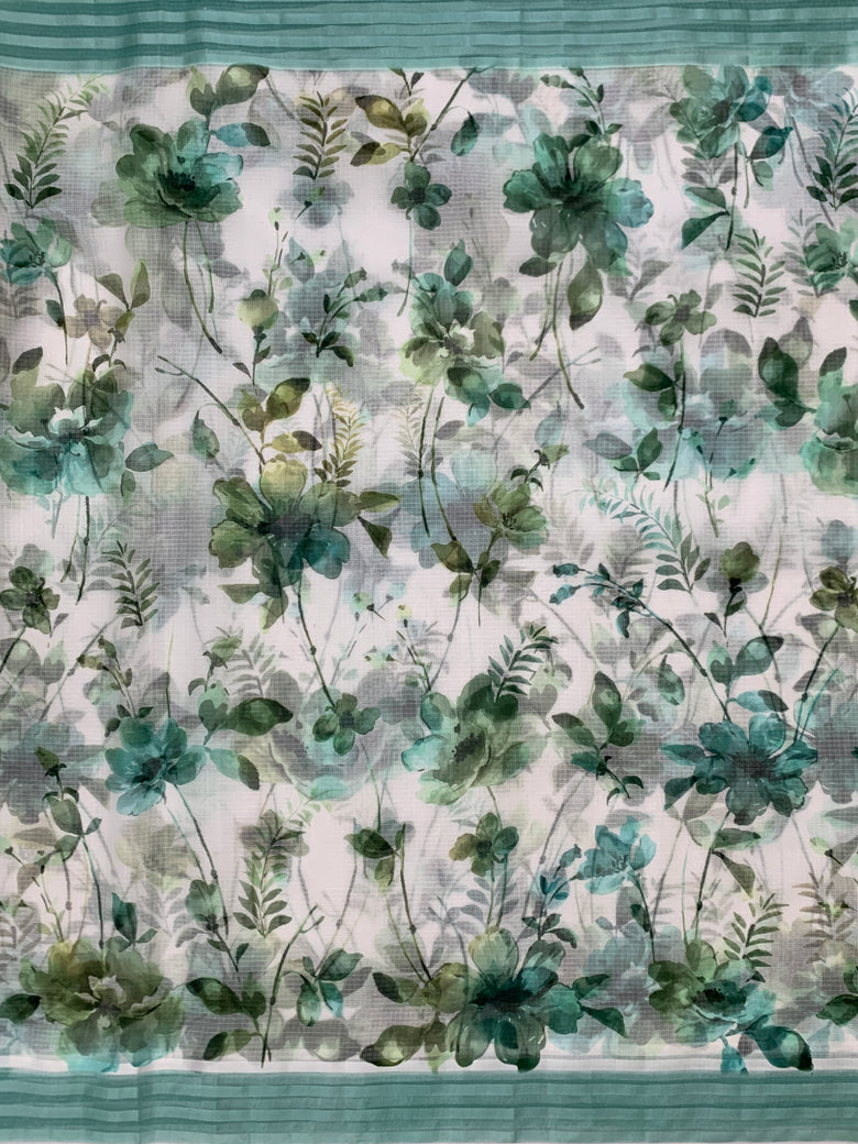 This gorgeous saree is crafted from silk kota fabric and features an all-over floral Printed. The contrast border and zari strips adorning the pallu add an extra touch to the look. The bright white color brings out the vibrancy of the Printed. Complement this ensemble with a self-floral Printed blouse with contrast border.
