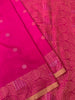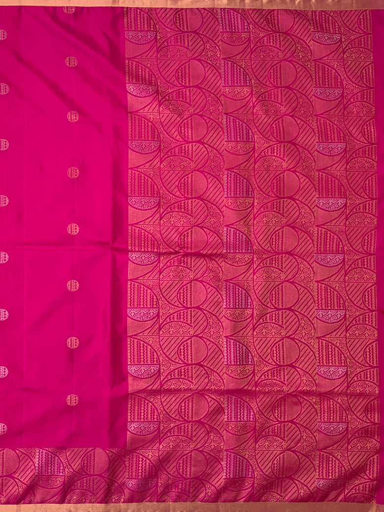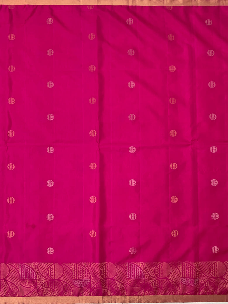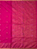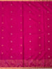 This tranquil Soft Silk Saree drapes the wearer in a mesmerizing pattern of silver and gold zari polka butta that adorns the body, while a self zari geometrical border and bright pink pallu grace the perimeter. The included self-plain blouse rounds out the picture with a kaddi border.