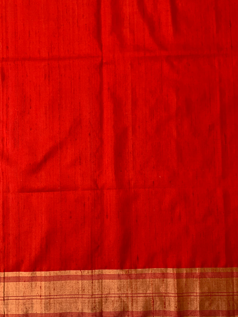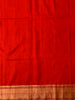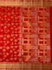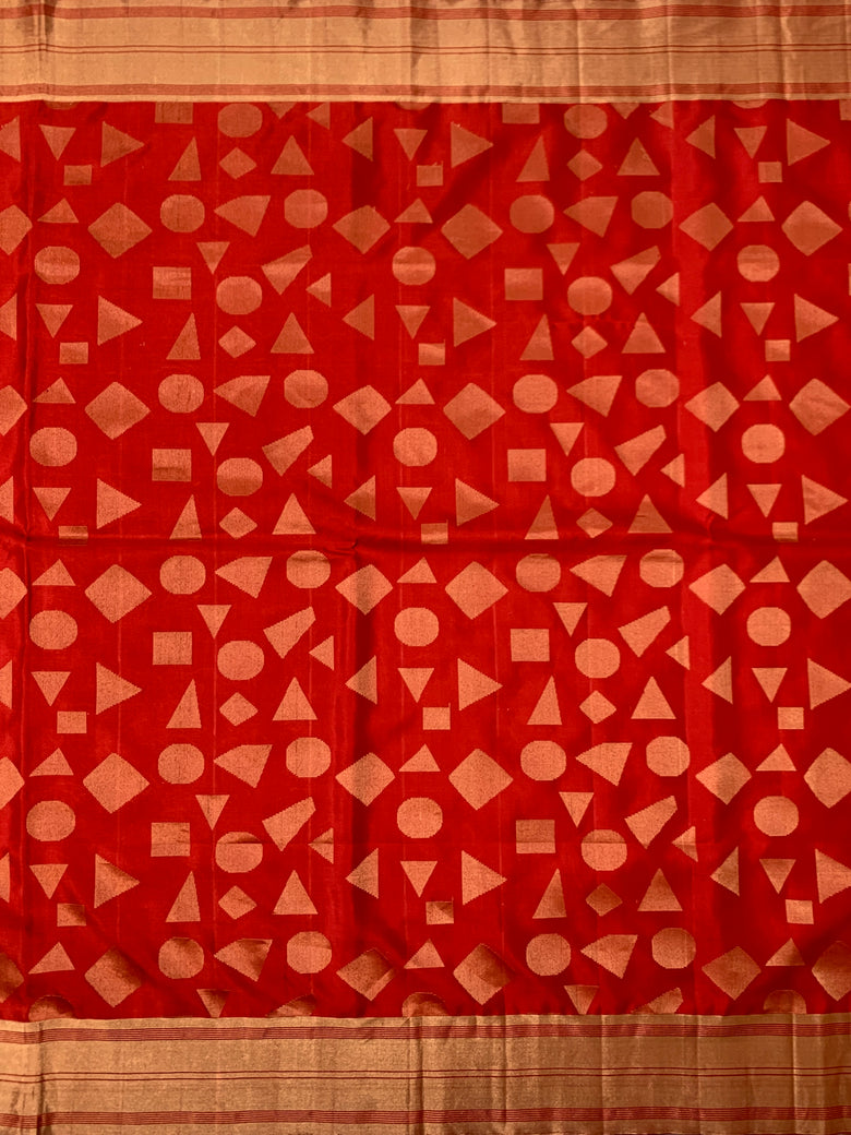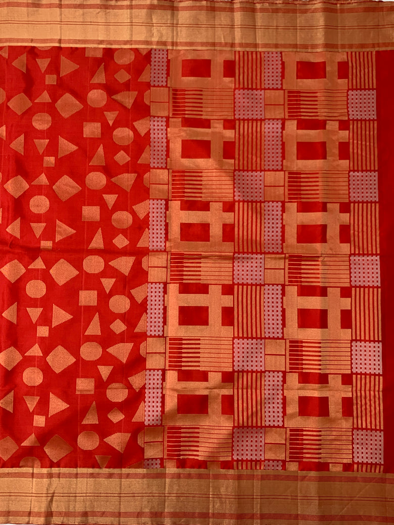 This Soft Silk Saree features an all-over gold zari geometrical design, as well as a self kaddi border and gold and silver zari traditional pallu. The Red hue of the saree is enhanced with a simple self blouse accentuated with a classic border, creating a graceful, traditional Indian elegance in a classic, timeless fashion, ideal for any special occasion.