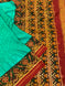 This Tissue Zari Kota Saree features an intricate weave of all-over gold zari and meenakari, creating a beautiful floral laheriya pattern. The saree itself is adorned with a self meenakari floral border and pallu, all in a stunning sea-green color. The blouse is crafted with a contrasting gold zari floral butta and zari border for a complete and elegant look.