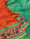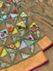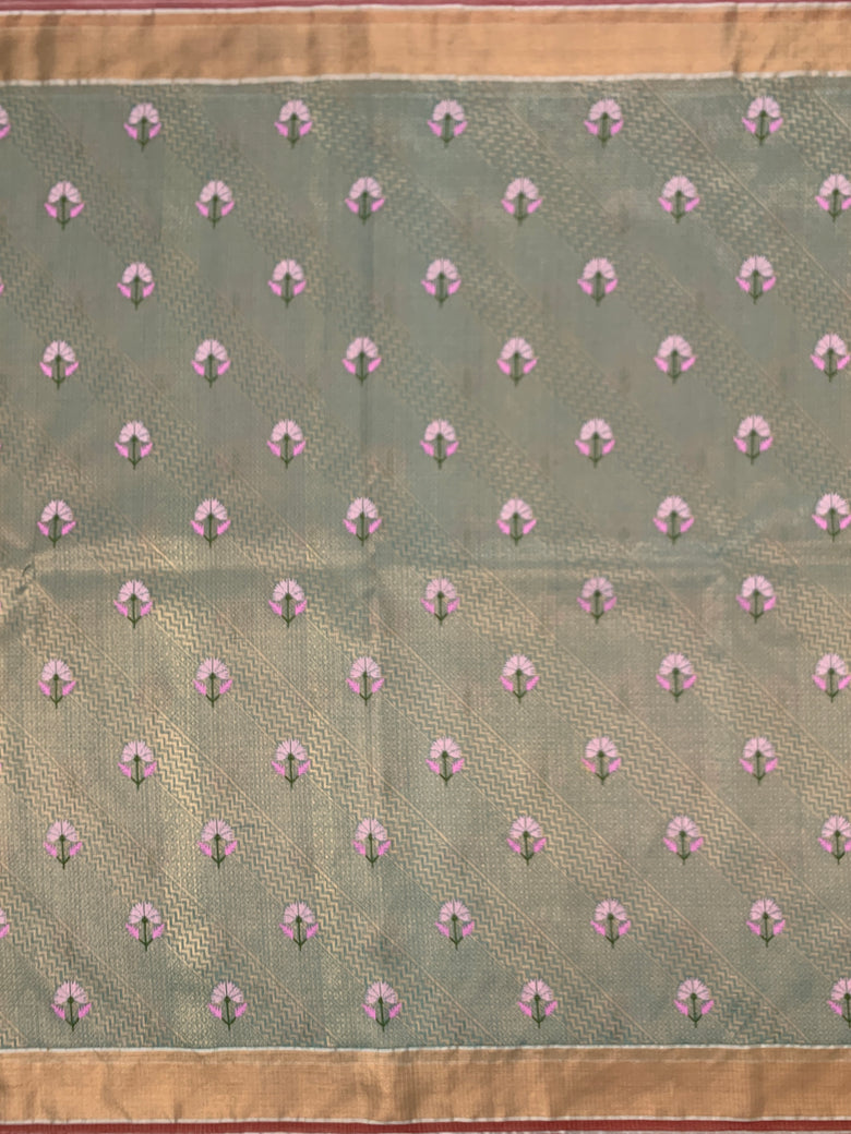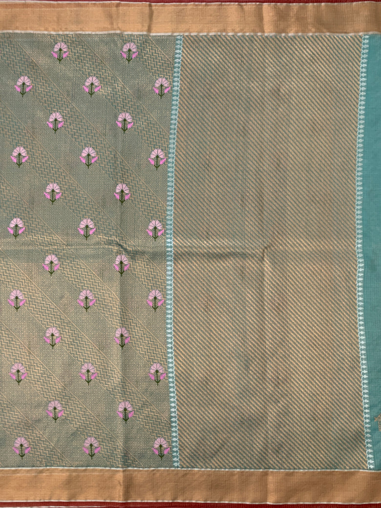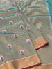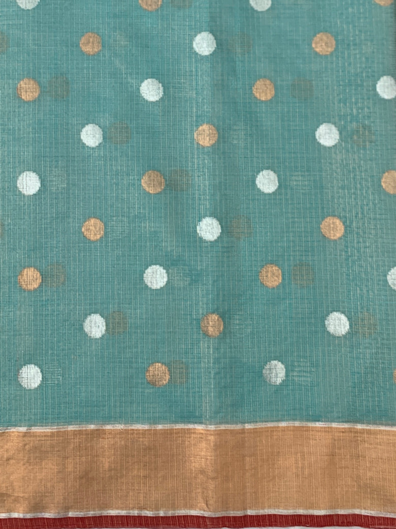 Featuring a luminous sea-green hue, this Tissue Zari Kota Saree is further enhanced with ornamental golden zari brocade weaves and meenkari floral buttas. Delicately completed with a resplendent gold zari kaddi border and brocade pallu, this piece is set off with golden and silver zari polka buttas, along with a kaddi border in the blouse.