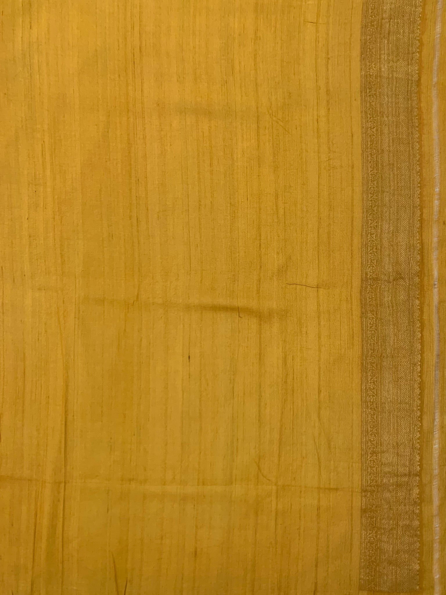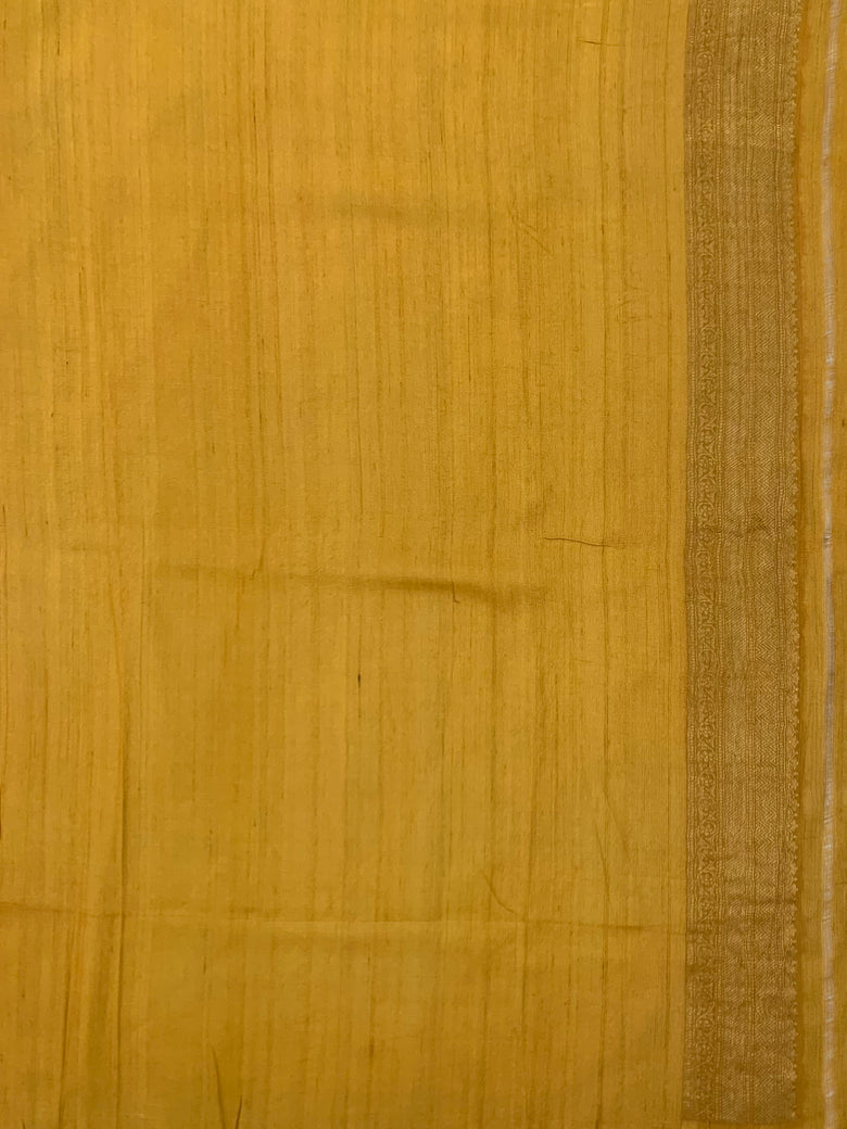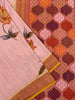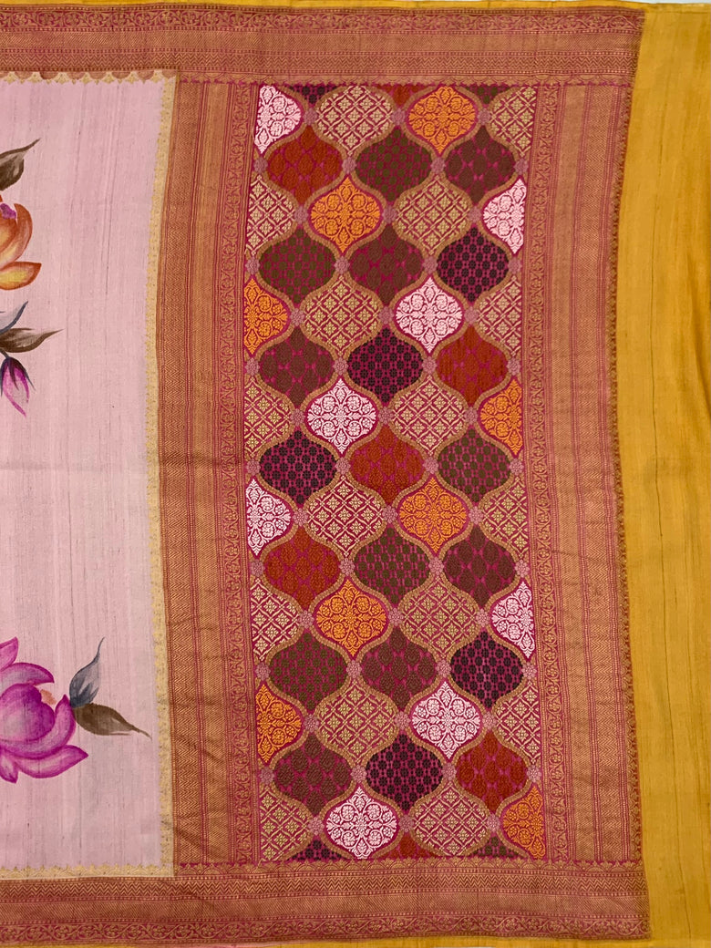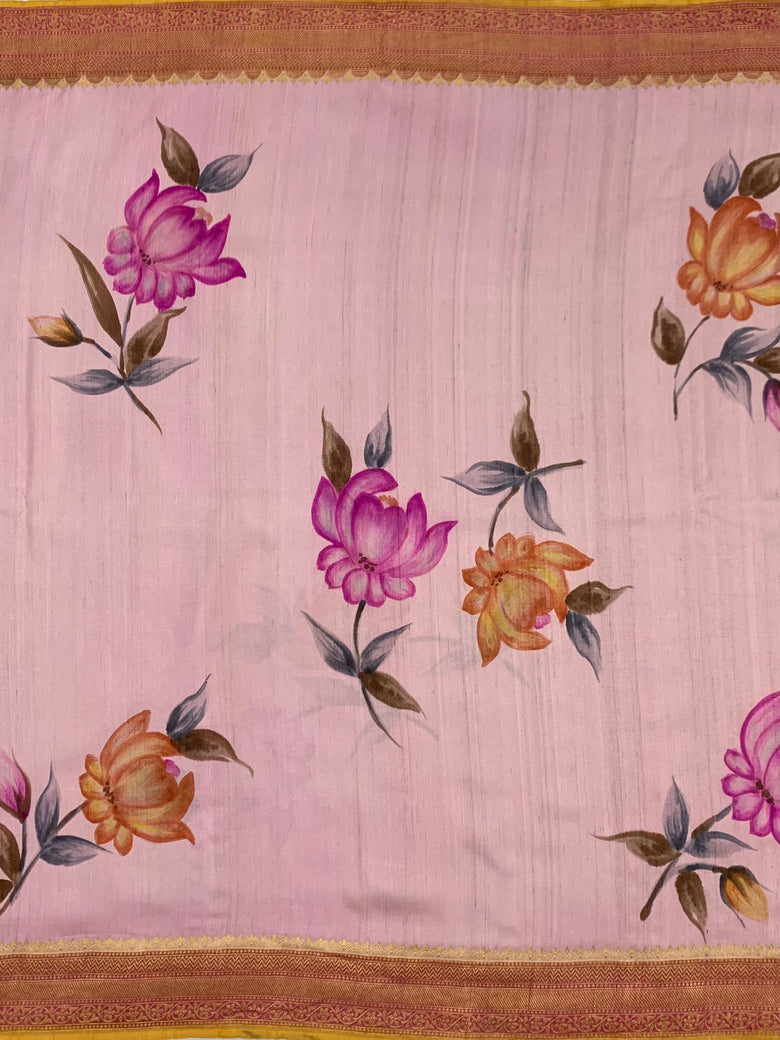 This Tussore Georgette Saree features an all-over brush-painted floral butta design, along with a contrasting floral border and a meenakari geometric pattern on the pallu. The light-peach color adds a delicate touch, while the blouse is a plain contrast with a zari border.