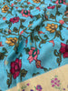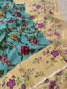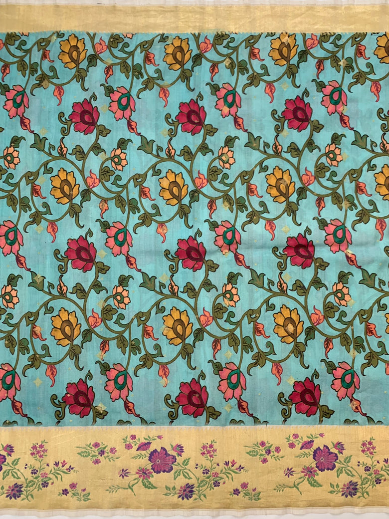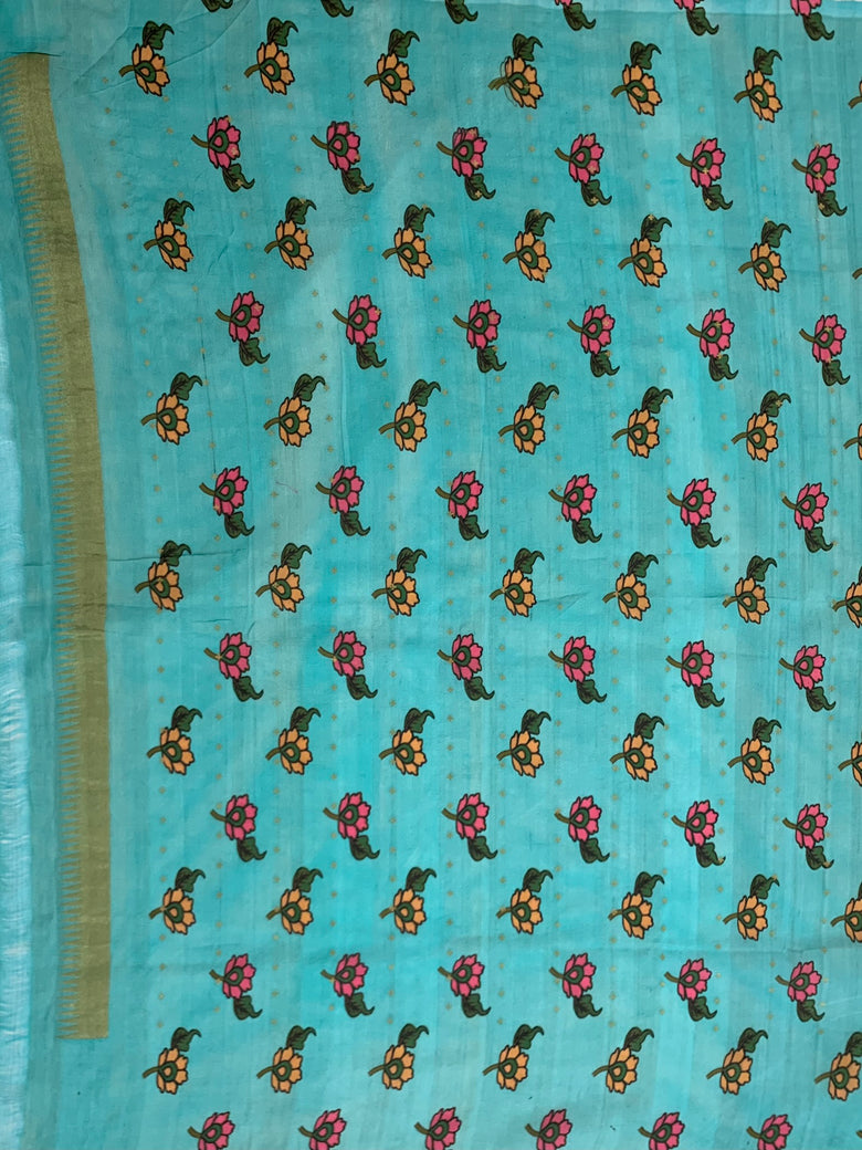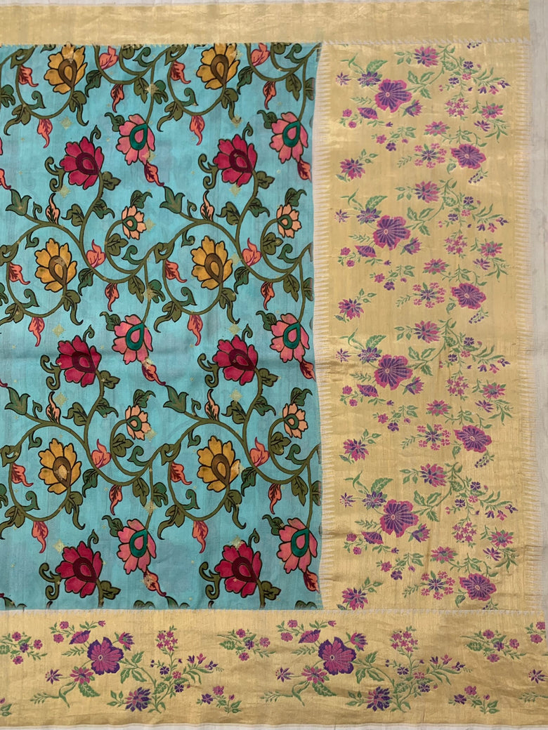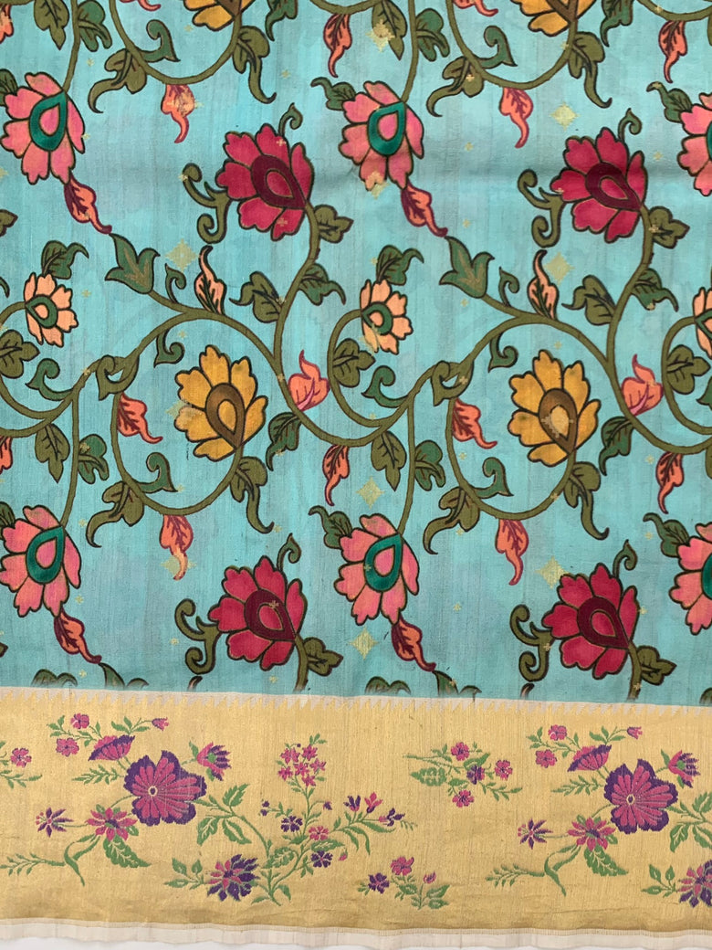 This Tussore Georgette saree features a classic all-over gold zari butta and floral Printed with a vibrant multi-colour meenakari floral border and pallu, finished in a timeless light-blue hue. The included blouse is self-printed and includes a zari border.