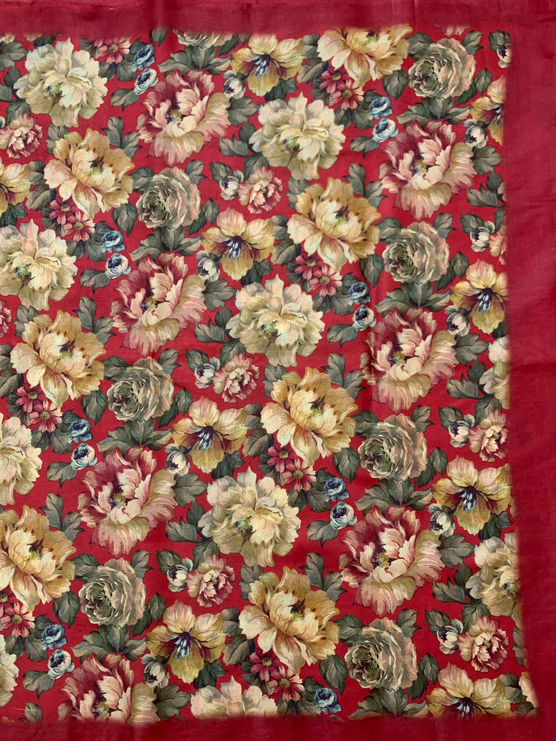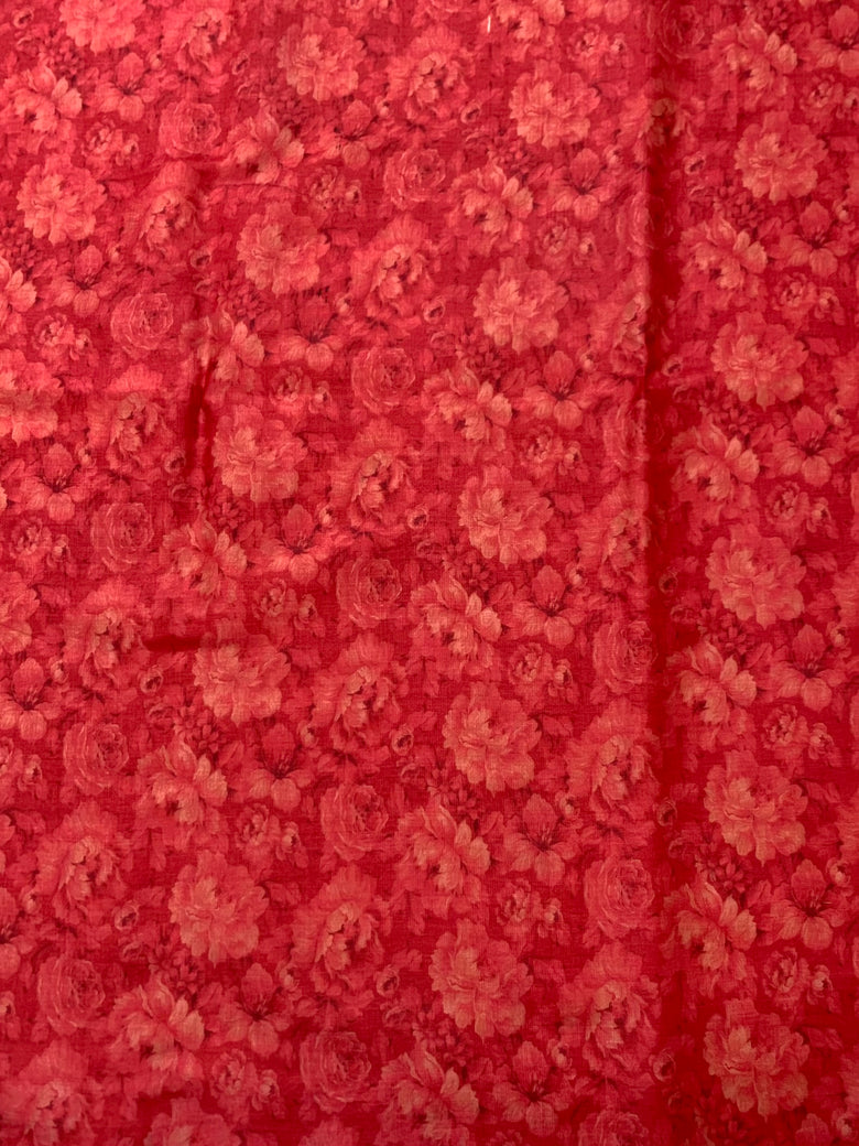 Featuring luxurious Tussore silk, this vibrant saree features an all-over pattern of multicolored blooms along with a solid-colored border and pallu, finished off with a self-floral printed blouse to complete the look. The saree comes in a vivid red hue.