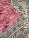 This green Tussore saree features geometrical patterns and a floral aari-work border and pallu, making it a unique and stylish choice. The contrast blouse adds a touch of elegance to the overall look.