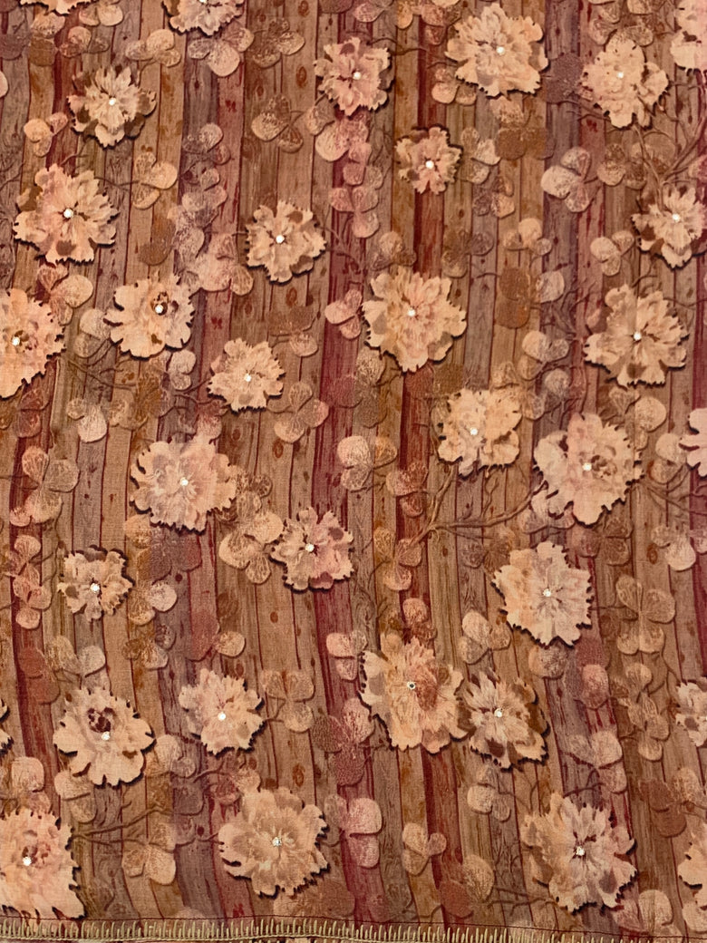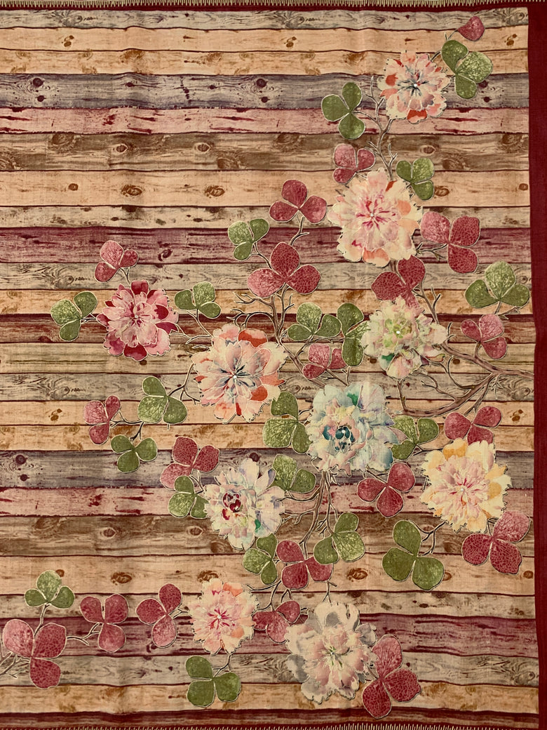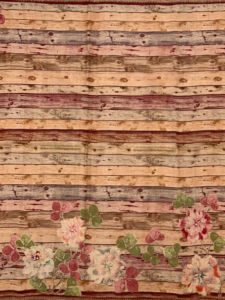 This tussore silk saree is crafted with all-over stripes and floral patterns, adding visual interest with aari embroidery to the saree, small thread border and pallu. It comes in an exquisite multi-colour finish, complete with a stunning contrast floral Printed blouse.