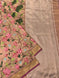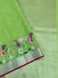 This hand-woven Zari Kota Saree features intricate silver and gold floral and geometric designs, including zig-zag borders and a laheriya pallu. The yellow color adds vibrancy to the saree, while the accompanying contrast butta blouse with zari border completes the look.