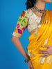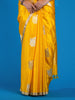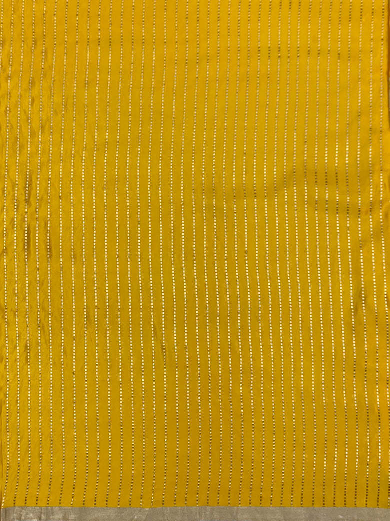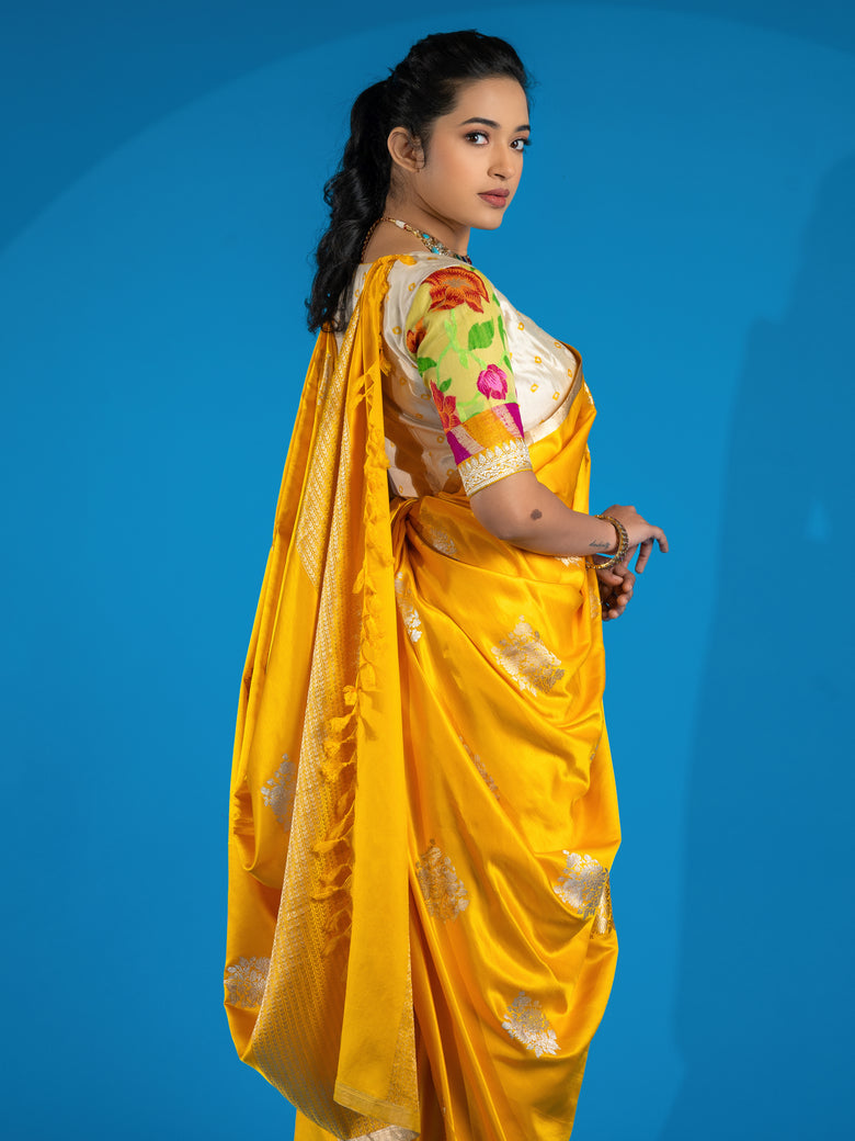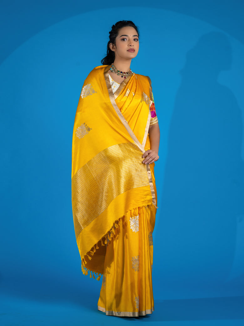 Mashru silk saree features gold and silver zari floral buttis throughout the weave, along with a self small kaddi border and a brocade pallu. The saree is a vibrant mango-yellow color and includes an unstitched running blouse piece in a self zari stripes design with border.