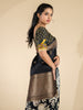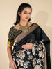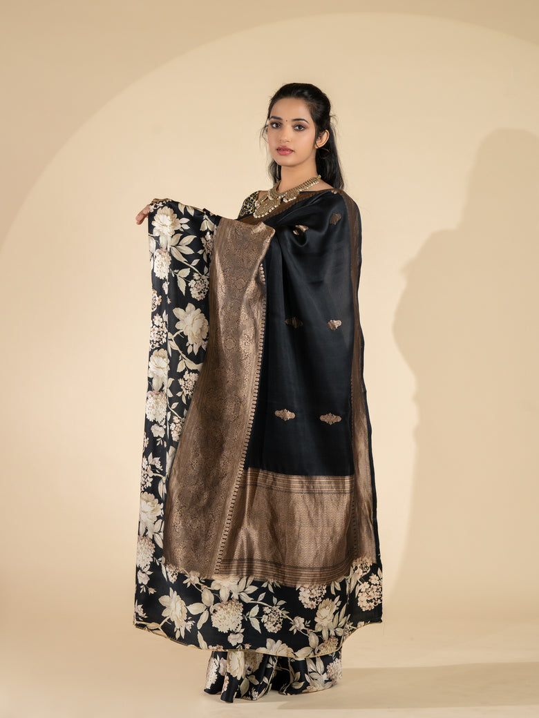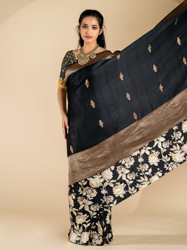 This elegant mashru silk saree features a beautiful weave of gold zari floral buttis throughout the saree. The self gold zari and printed floral border and pallu add a touch of sophistication to the black color. Additionally, you will receive an unstitched blouse in a coordinating self, floral printed and zari stripe design.