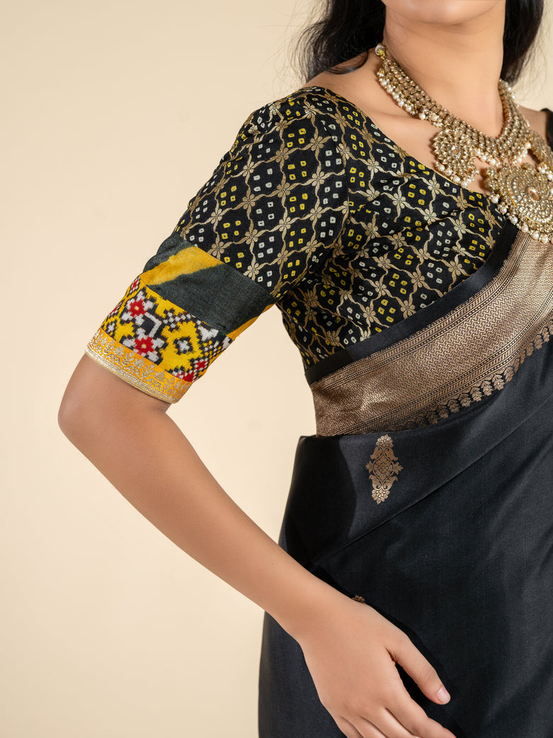 Fusion bandhani intricate floral patterns in gold zari, with tussore and patan patola border.