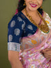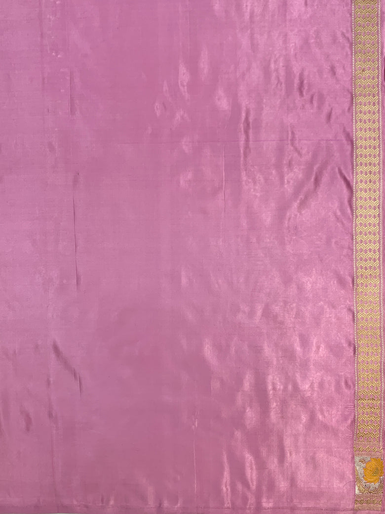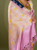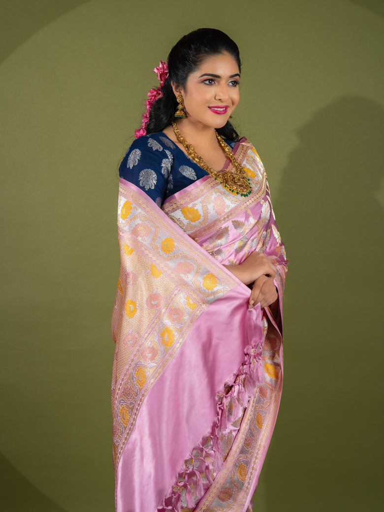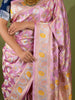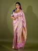Handwoven Mashru silk saree boasts an elegant light-pink color and features a beautiful all-over Kadwa weave of gold, silver, and meenakari floral patterns. The saree also includes a self floral border and pallu, and comes with an unstitched running blouse piece in a simple plain design with a border.