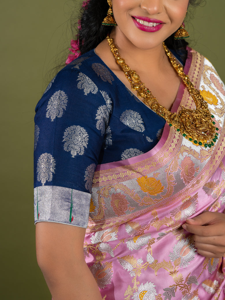 Fusion navy-blue banarasi silk blouse features intricate silver zari floral buttis and self sleeves with a single muniya border.