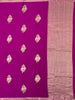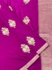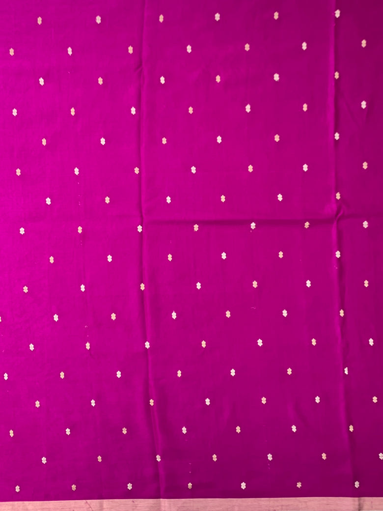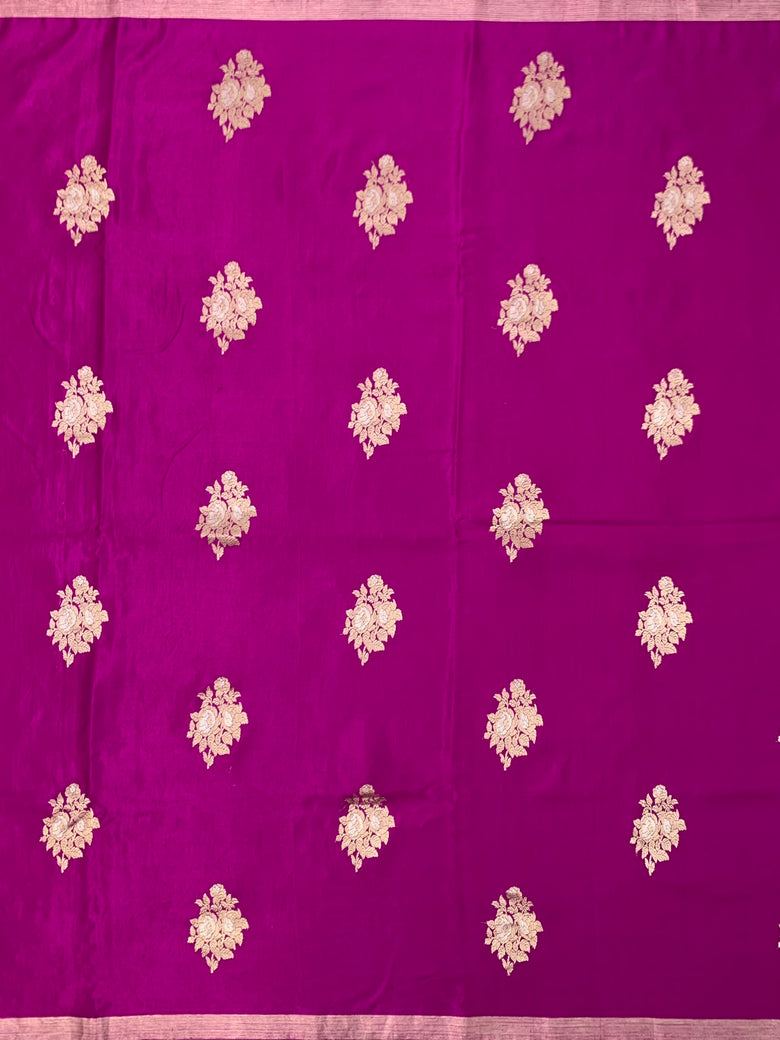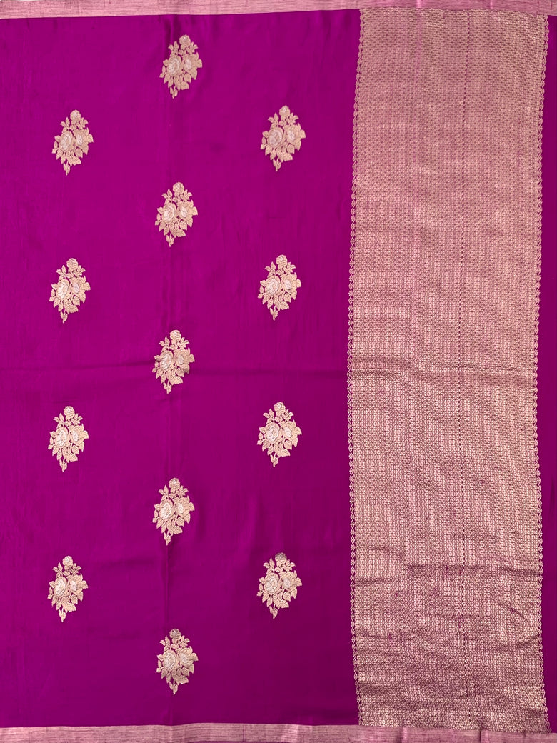 This Mashru silk saree in a beautiful magenta-pink color features a stunning design of gold and silver zari floral patterns that cover the entire body. The saree is completed with a small self kaddi border and a brocade pallu. The matching blouse is embellished with its own intricate gold and silver zari floral patterns and zari border.