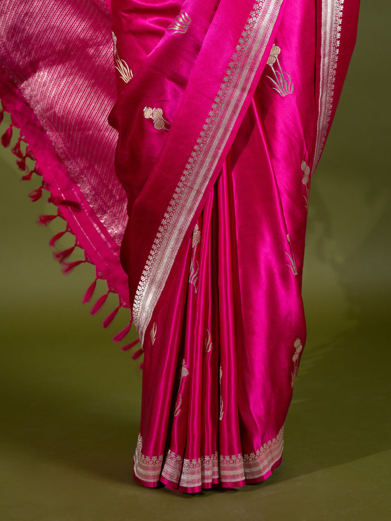 This beautiful mashru silk saree features gold and silver zari floral buttis intricately woven throughout the fabric. The rani-pink color and self small silver zari floral border add a touch of elegance, while the brocade pallu makes for a stunning finishing touch. you'll receive an unstitched blouse with a border.