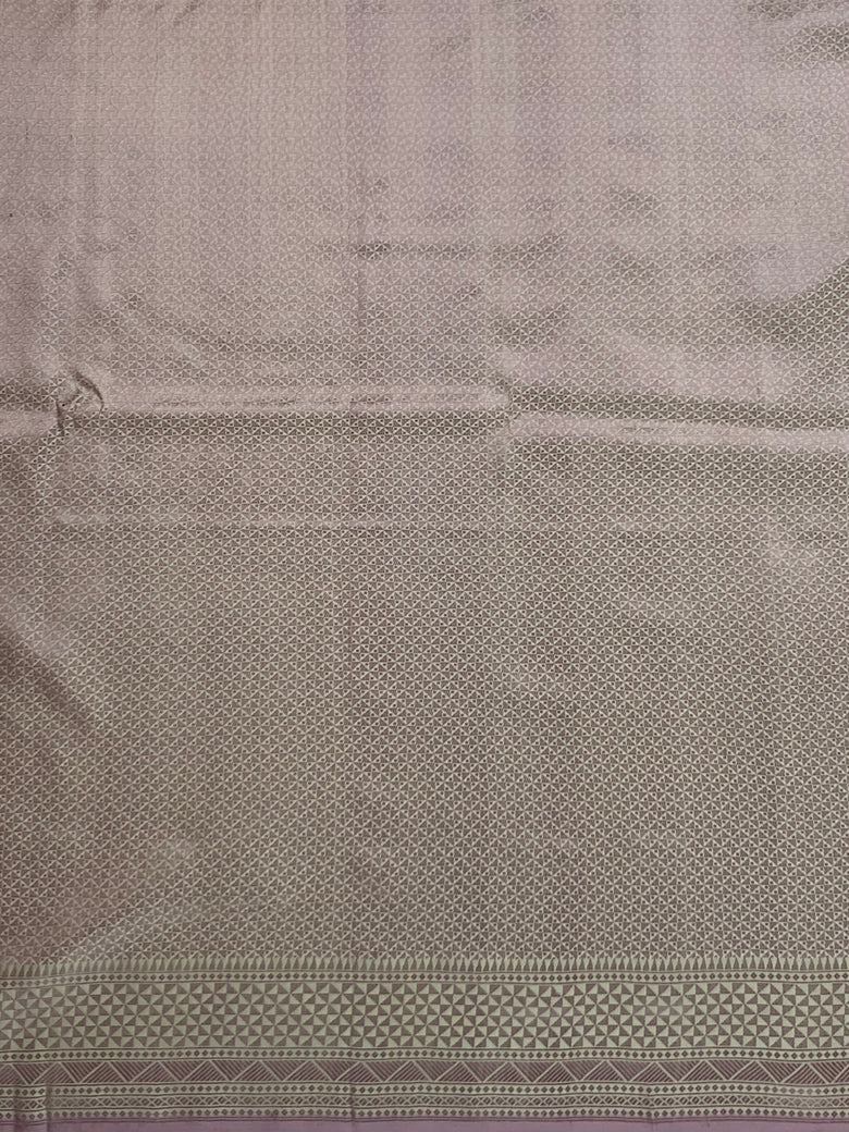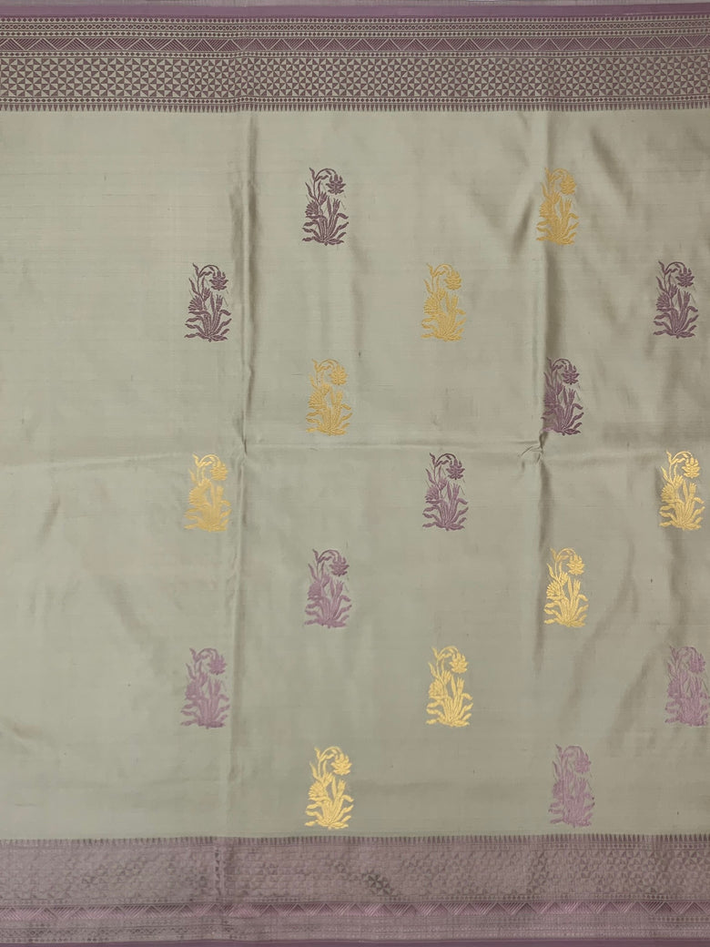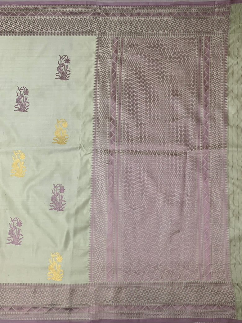 This saree features a beautiful mashru silk fabric and intricate meenakari floral buttis woven all over. The sage-green color adds a touch of elegance, while the self-threaded geometric border and brocade pallu complete the look. The matching self-brocade blouse with border is the perfect finishing touch.