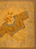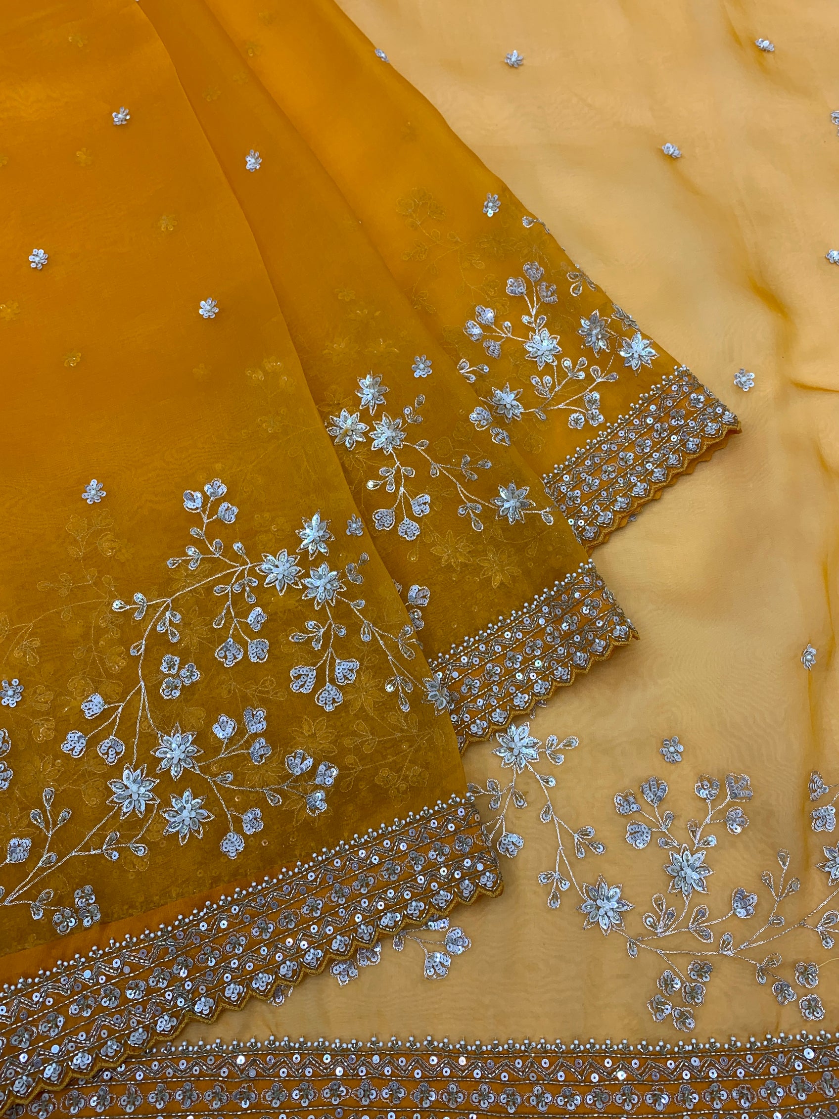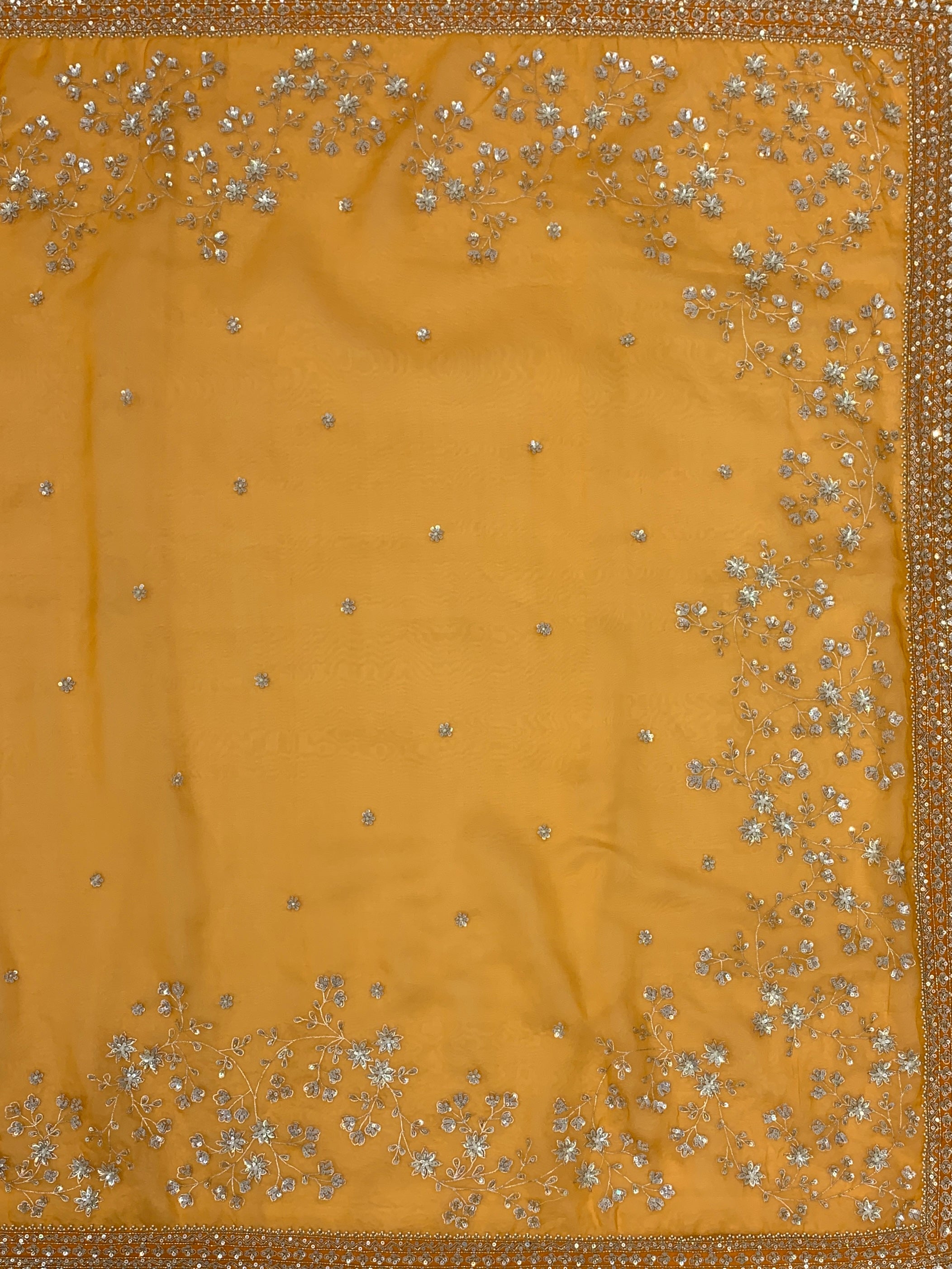 This stunning Orange organza saree showcases exquisite floral aari work, enriched with sequins and bead embellishments throughout. It boasts a fine border that harmonizes with the self-pallu. Complementing the saree is a coordinating readymade blouse featuring matching intricate designs.