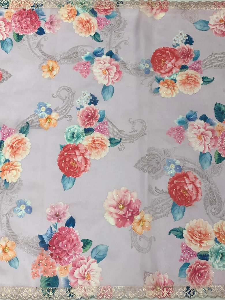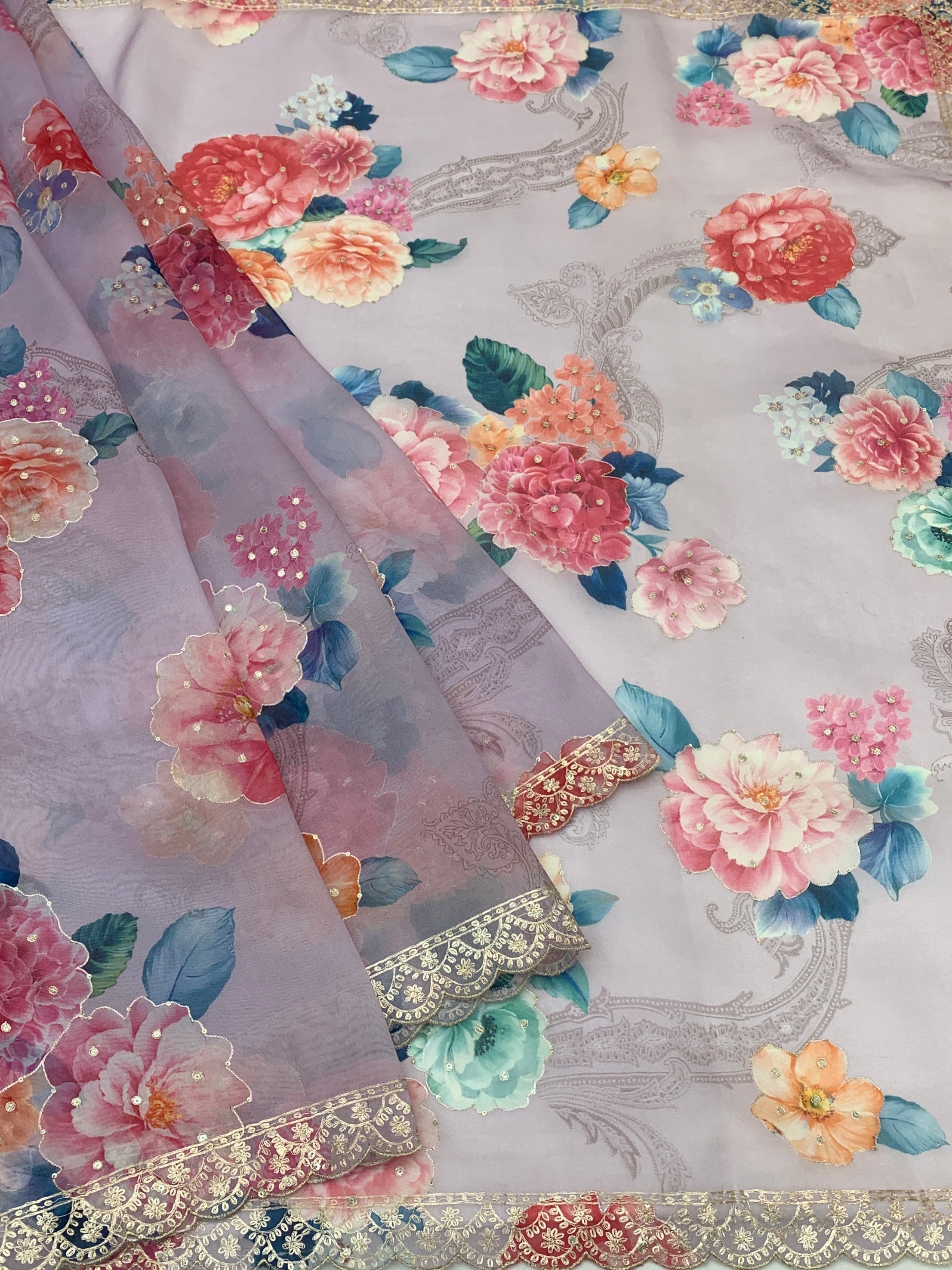 This exquisite lilac Organza Printed Saree is adorned with a subtle floral pattern throughout. It highlights intricate aari embroidery on the fabric, complemented by a scalloped aari work border and a detailed pallu. The blouse, crafted from plain self chanderi cotton.