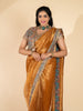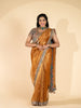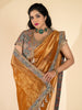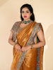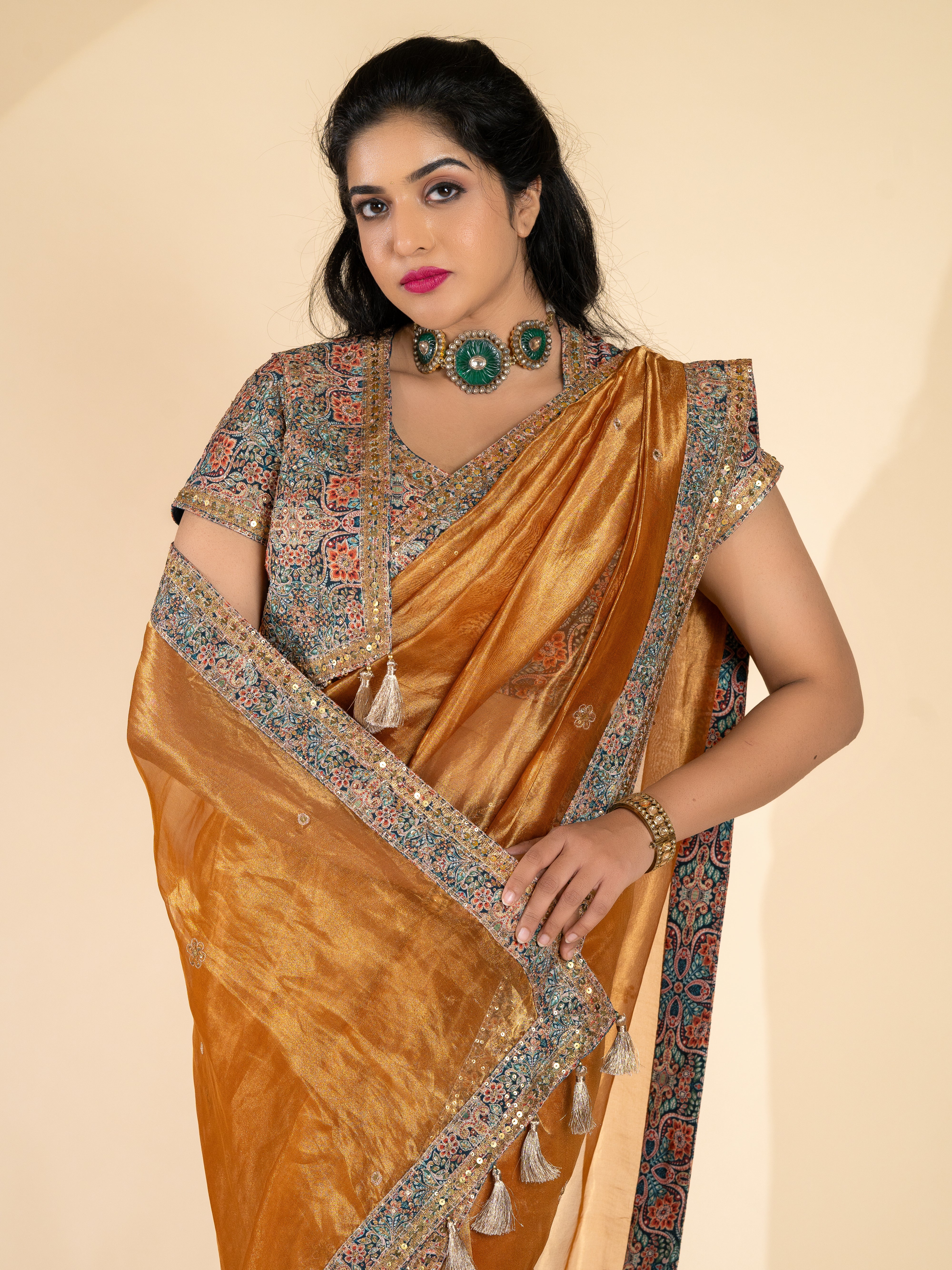 Tissue organza saree features an all-over woven sequin design, complemented by floral buttis created with aari-work. the border and pallu showcase a contrasting print with aari-work, all in a stunning shade of golden. the blouse also boasts a contrasting floral print with intricate work.