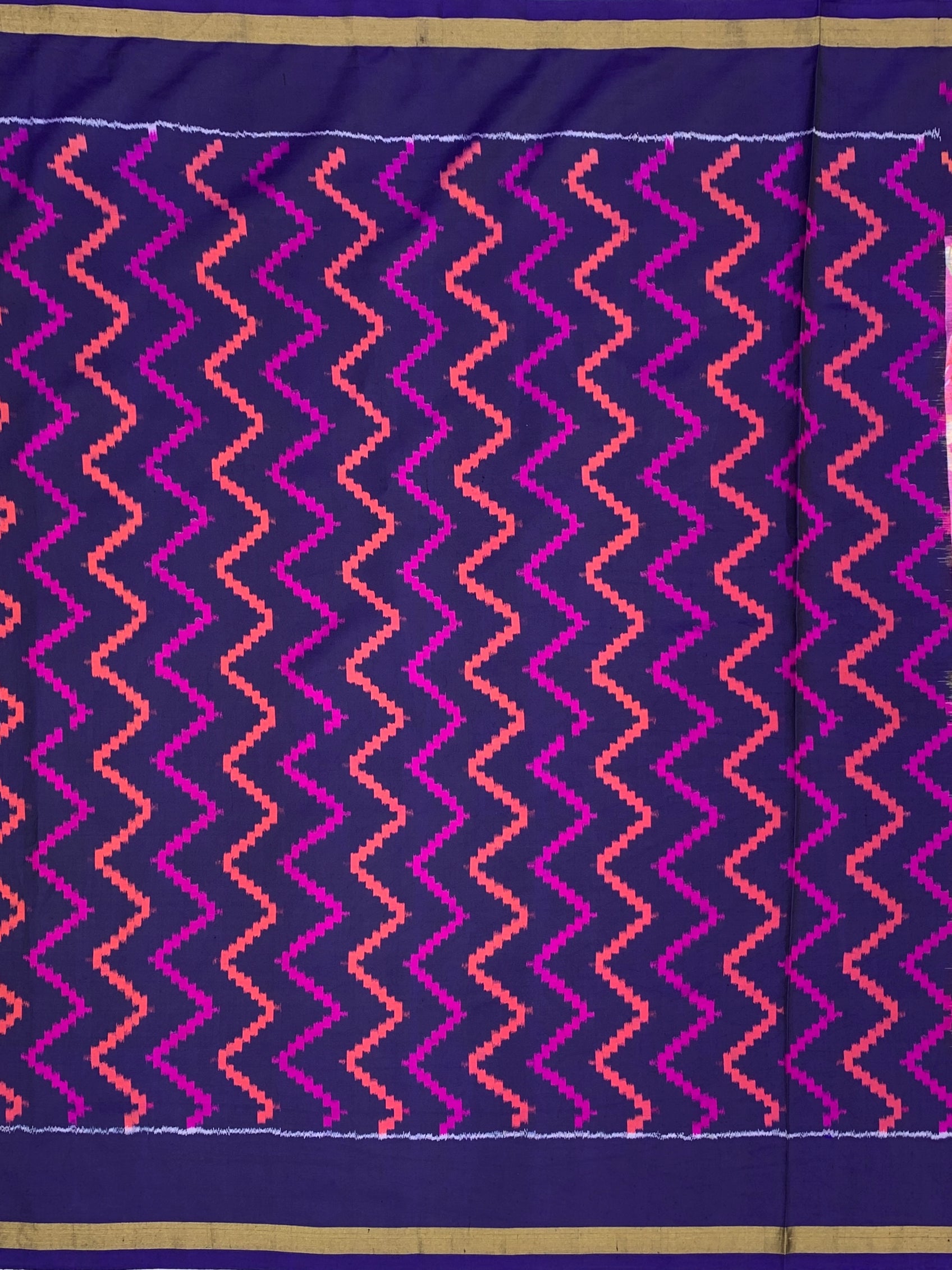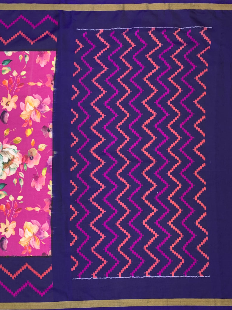 Patola saree features an all-over floral pattern, complemented by a contrasting zig-zag border and pallu. The light-magenta color enhances its elegance, while the blouse showcases a matching zig-zag design with a bordered finish.