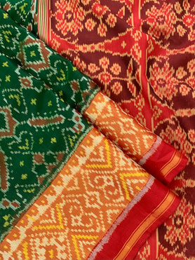This exquisite Rajkot Patola dual-shade saree features a stunning multi-colored Navaratan design, beautifully balanced with...