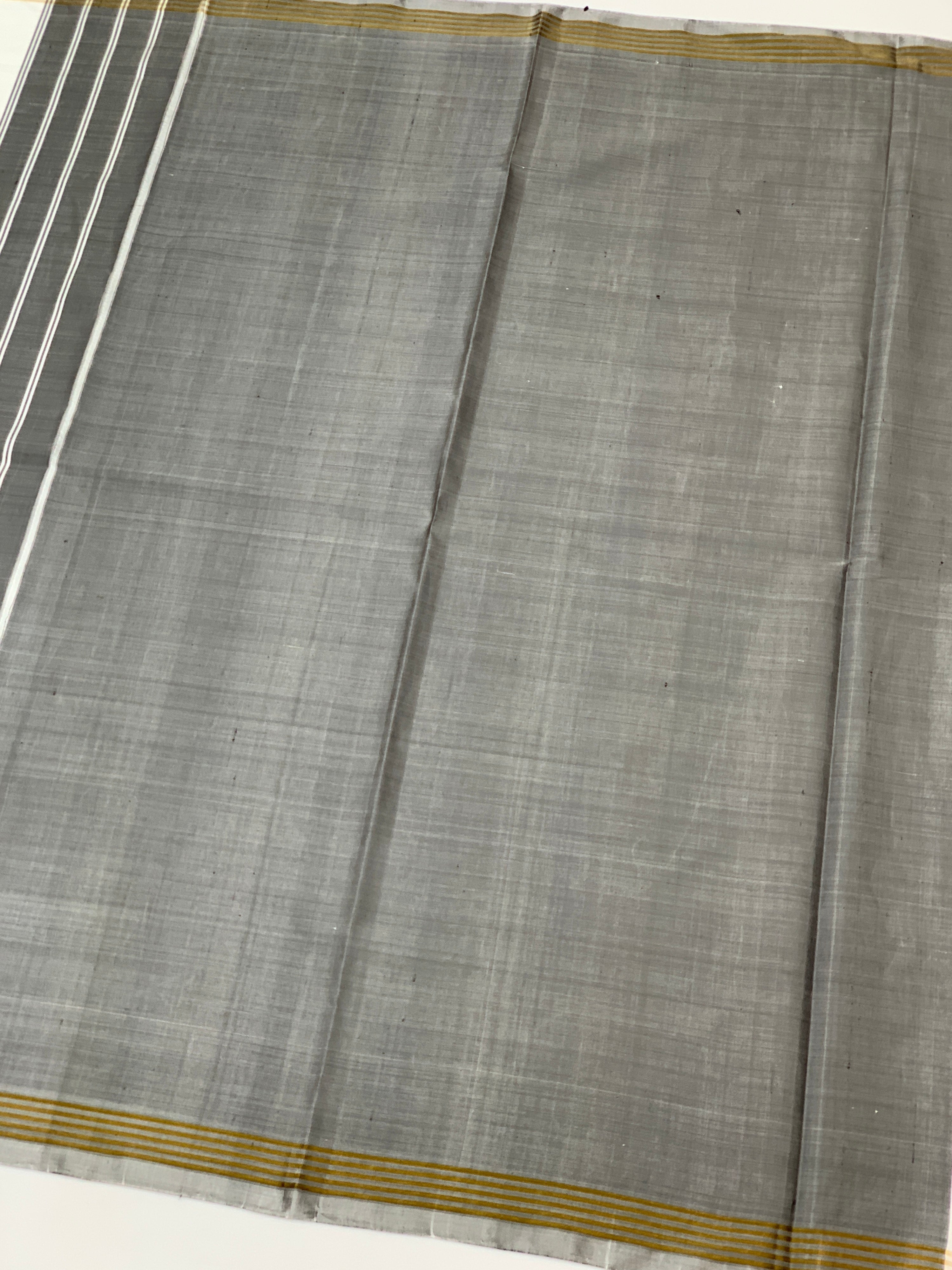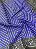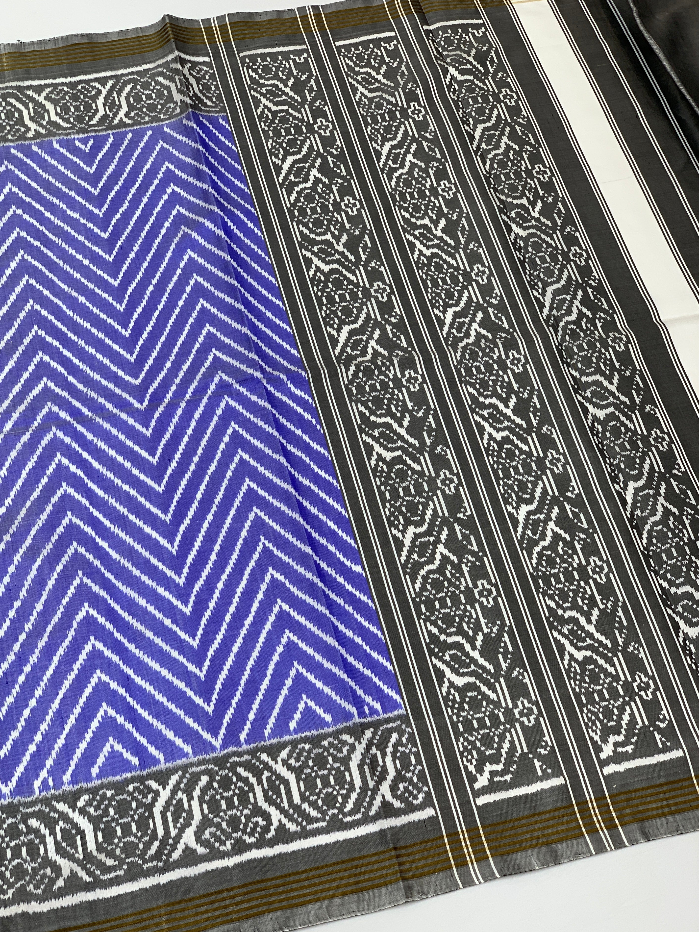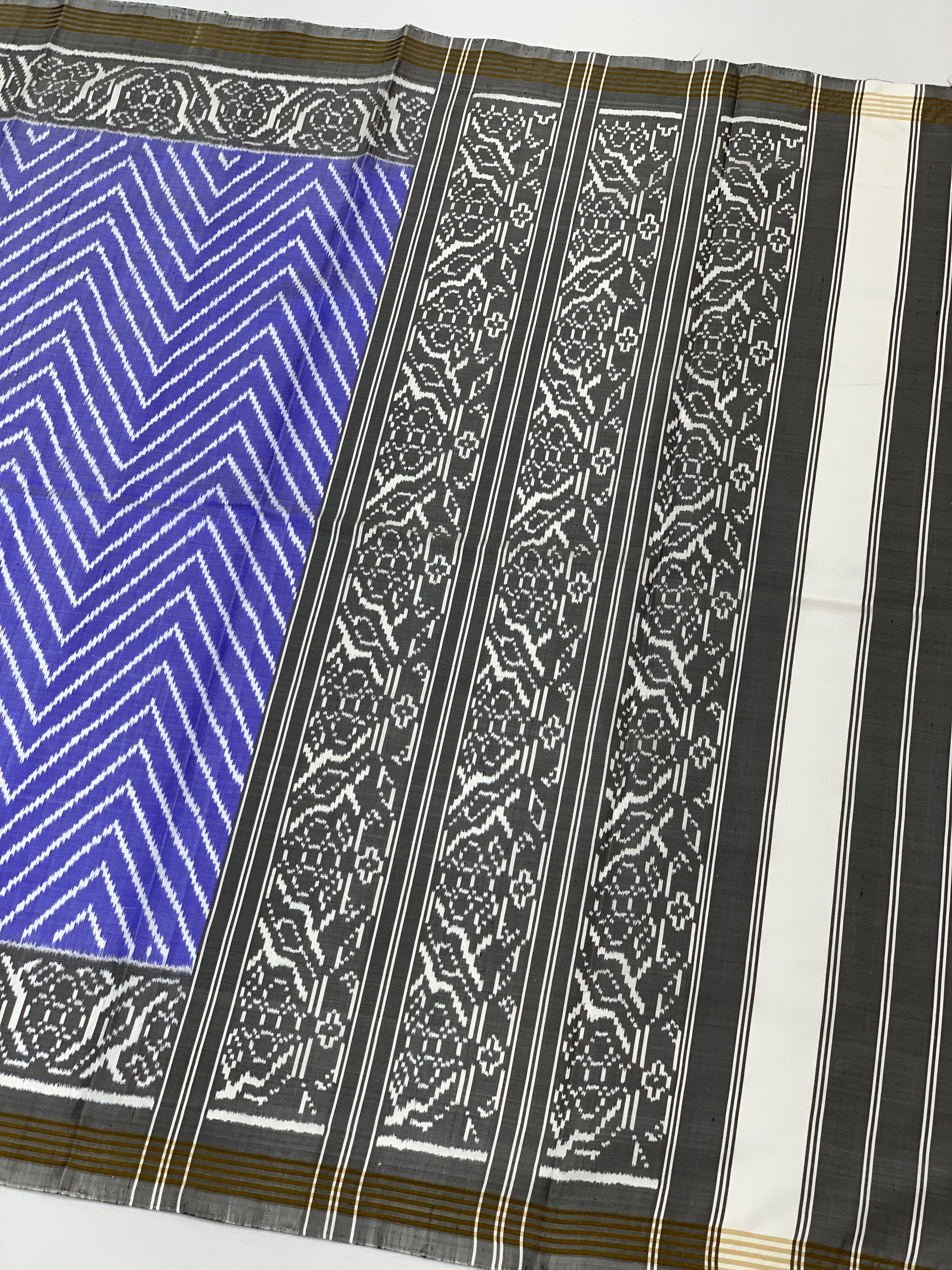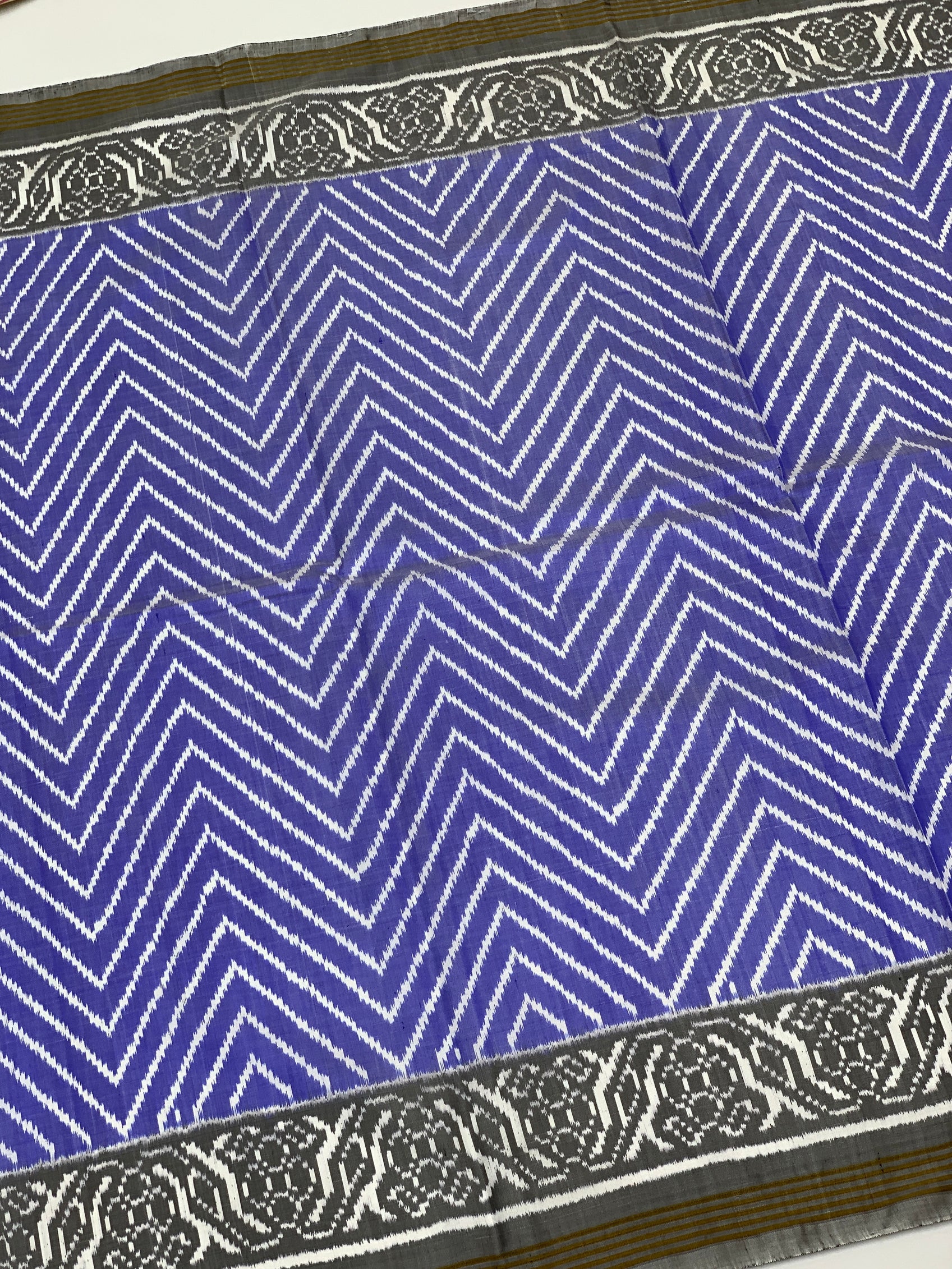 This Blue rajkot patola saree showcases a detailed all-over Zig-zag weave, highlighted by a contrast floral border and pallu. It comes with a matching grey plain blouse featuring a coordinating border for an elegant look.