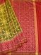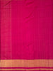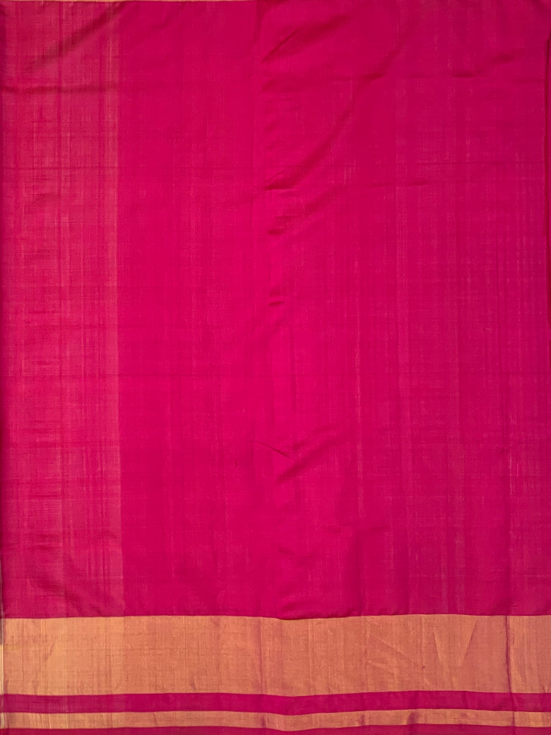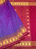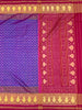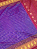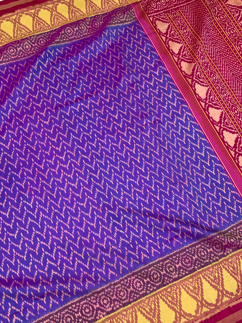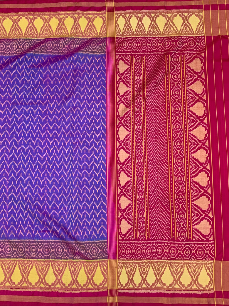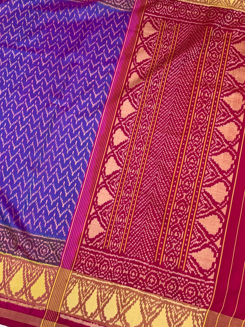 This Rajkot Patola saree features a sophisticated dual-shade design, combining a rich blue base with pink and purple accents. The intricate laheriya zig-zag pattern enhances its traditional charm, while the contrasting border and pallu create a striking visual impact. Complemented by a plain dark-pink blouse edged with a gold zari kaddi border.