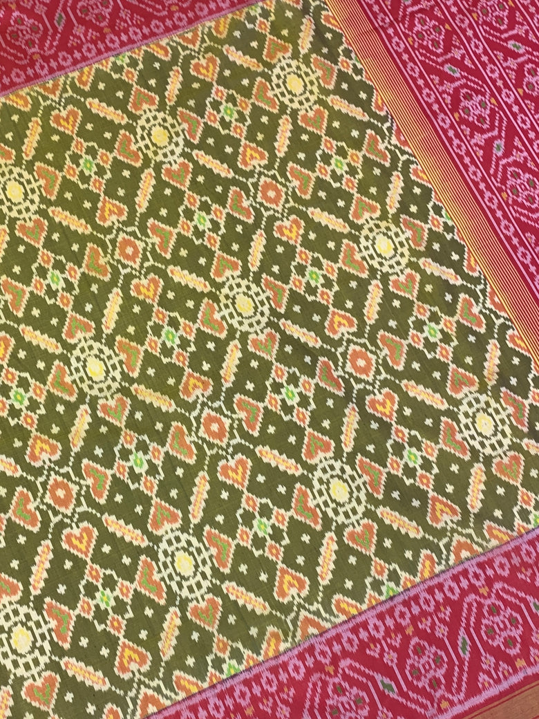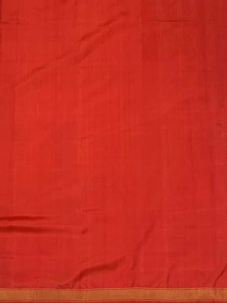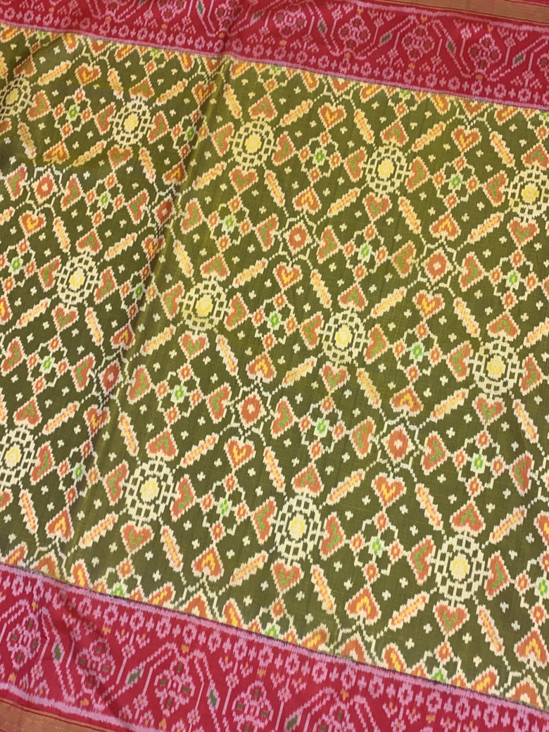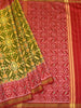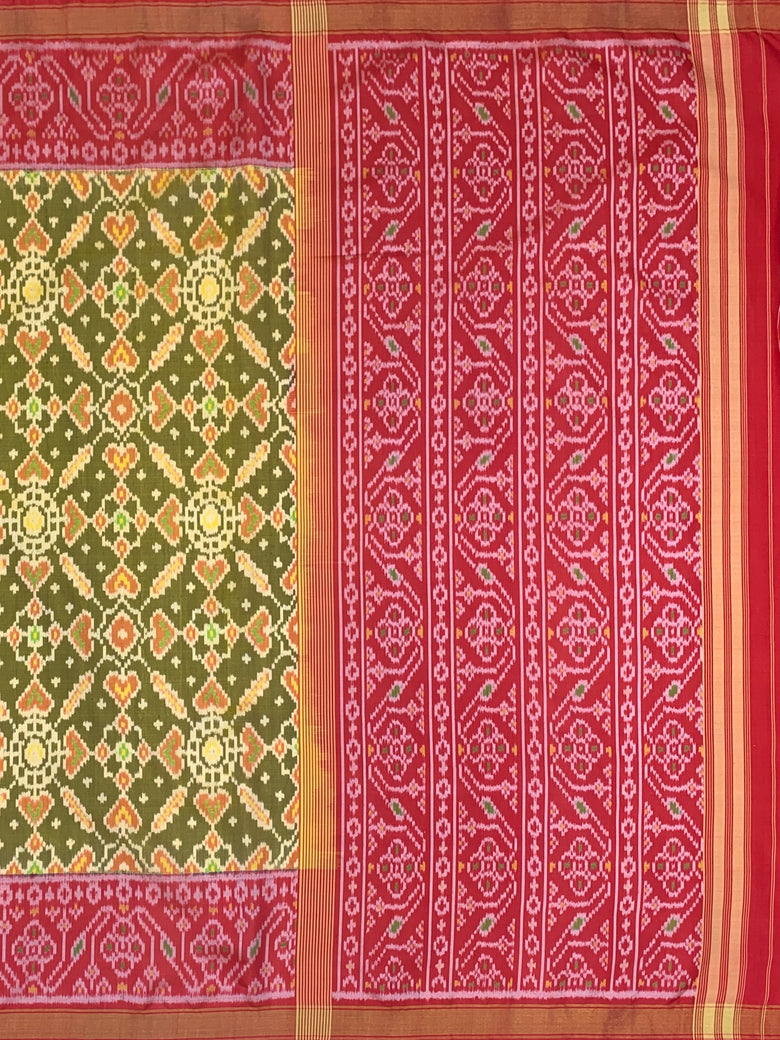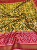 This exquisite Rajkot Patola dual-shade saree features a stunning multi-colored Navaratan design, beautifully balanced with a golden mustard primary hue and a dark grey secondary shade. The saree is accentuated by a contrasting floral border and pallu, enhancing its traditional charm. Paired with a plain red blouse detailed with a delicate gold zari kaddi border, perfect for special occasions where cultural heritage meets contemporary style.