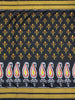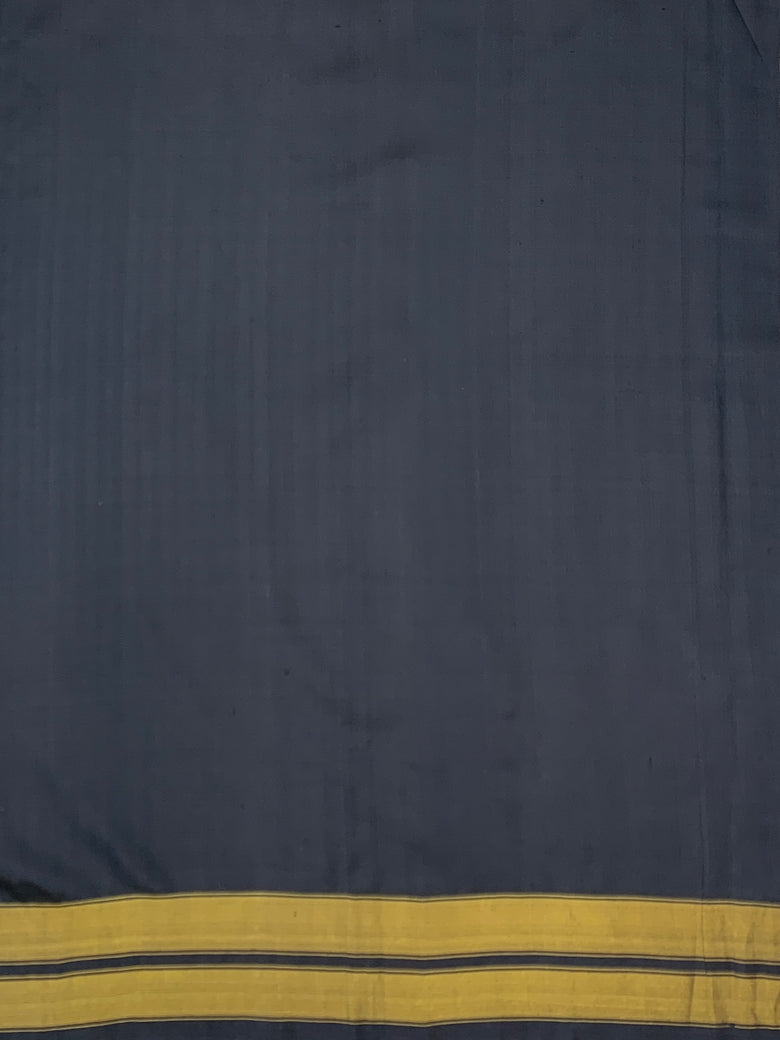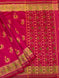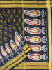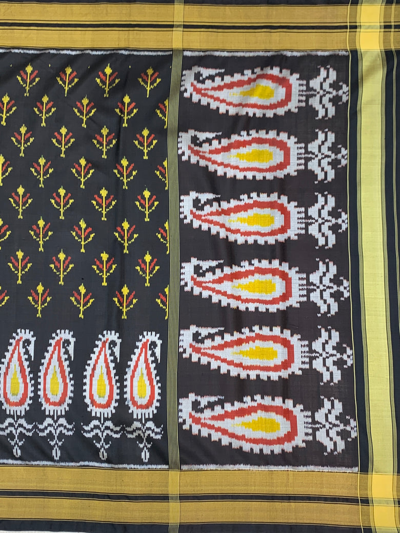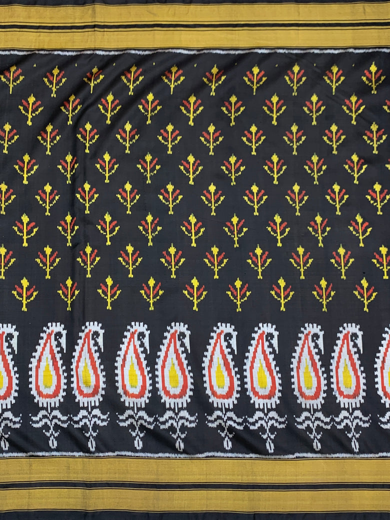 Black rajkot patola saree showcases a detailed all-over floral butti weave, highlighted by a self gold zari border and a floral pallu. It comes with a matching plain blouse featuring a coordinating border for an elegant look.