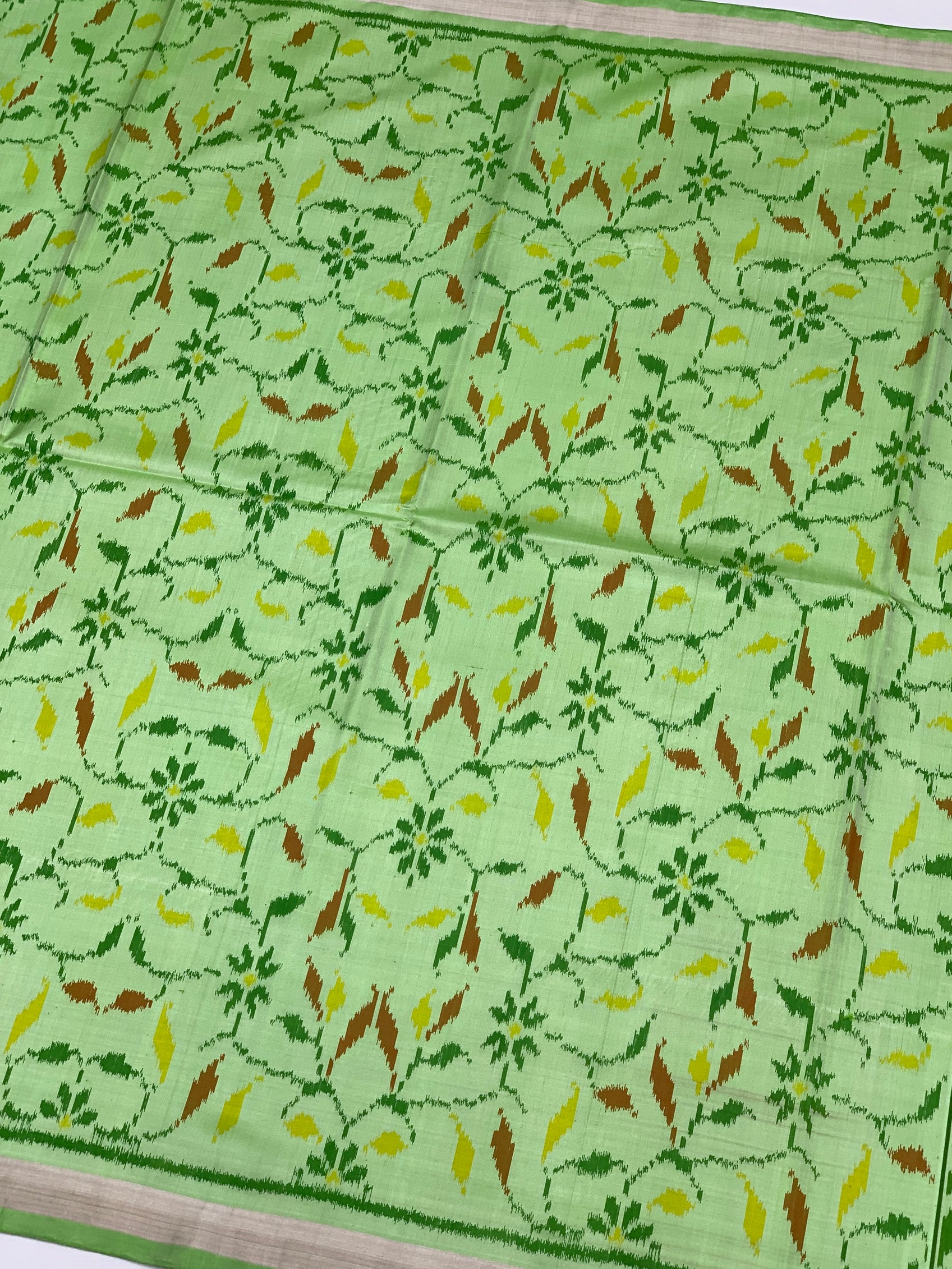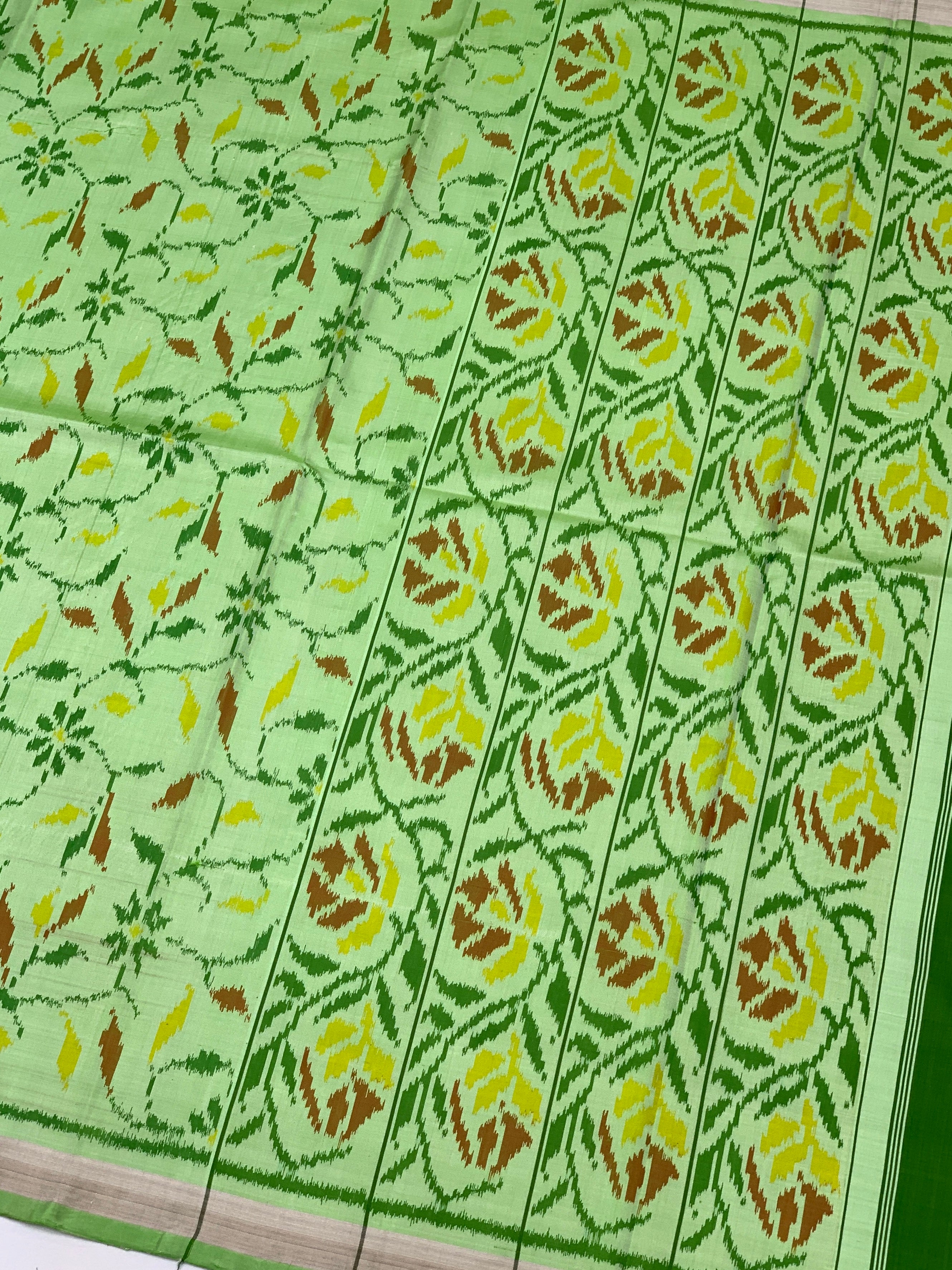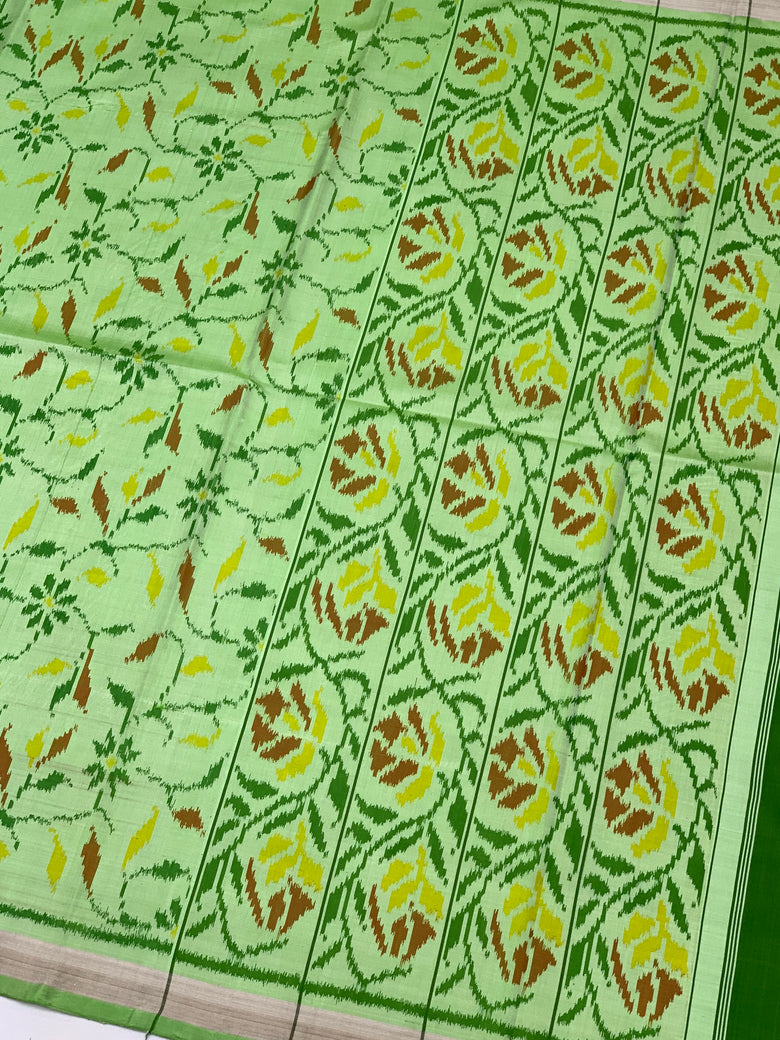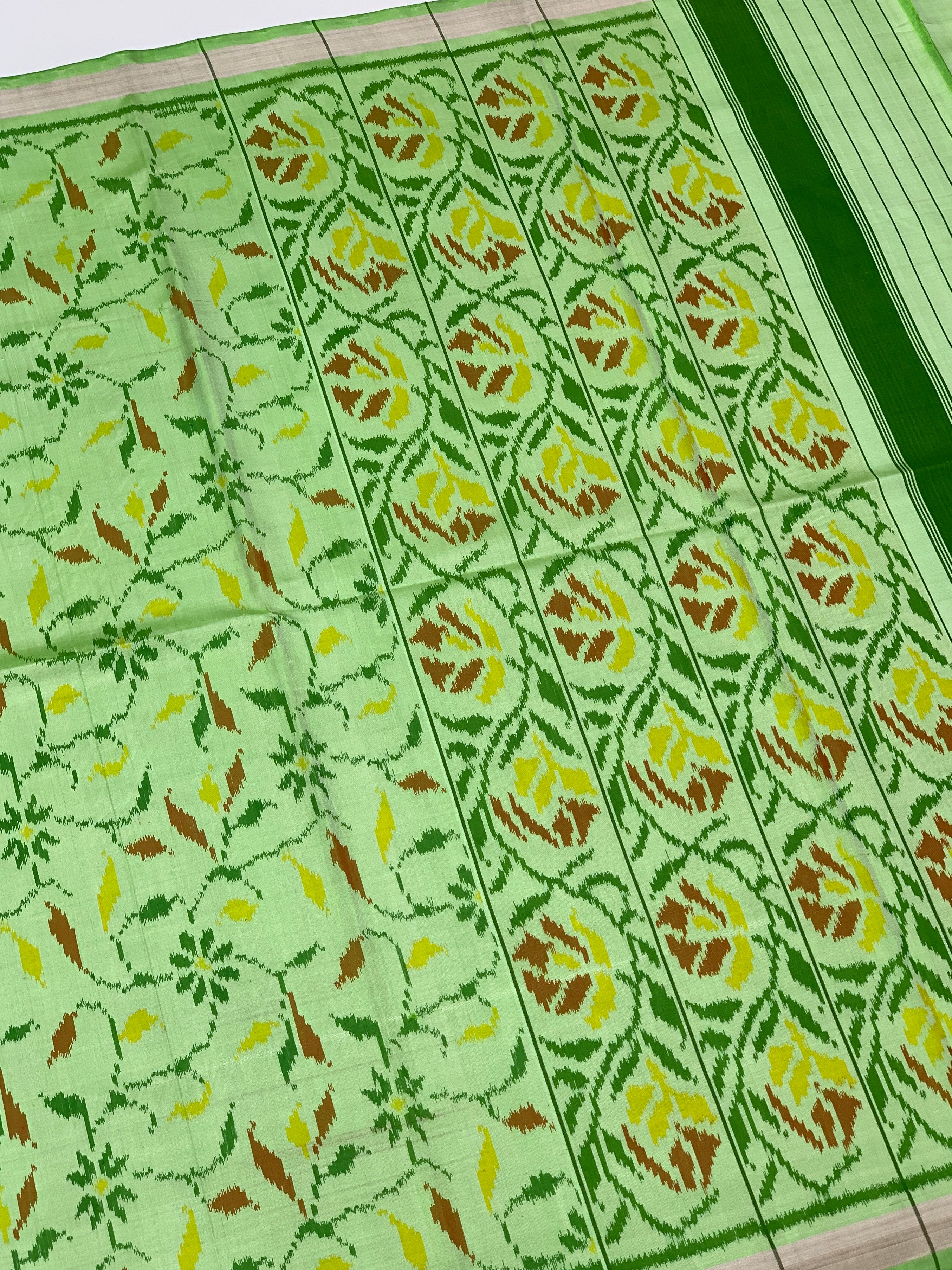 The green Rajkot Patola saree features an intricate all-over floral and peacock pattern, accentuated by a self zari border and a floral pallu. It includes a coordinating plain blouse with a matching border, completing a sophisticated ensemble.