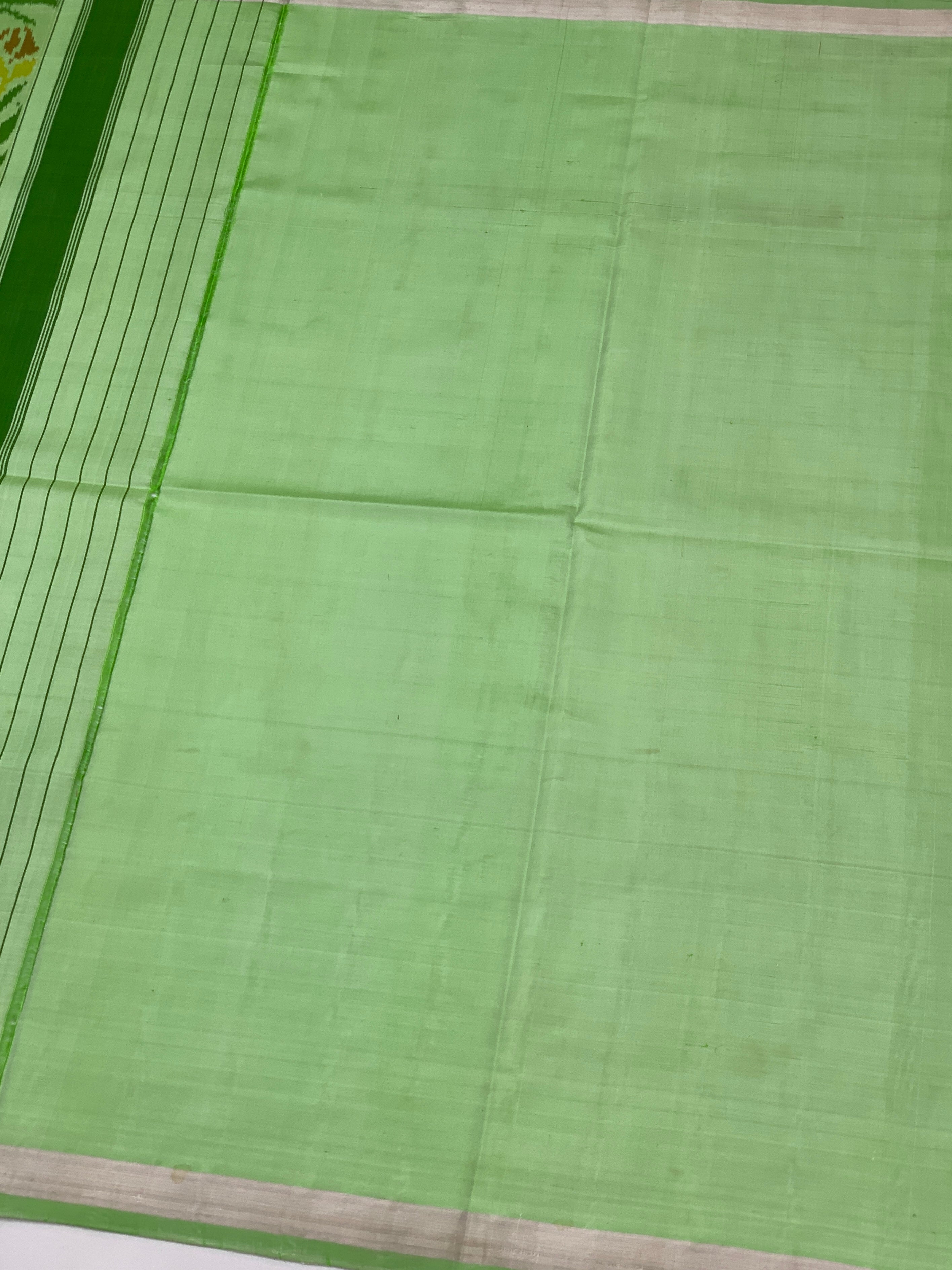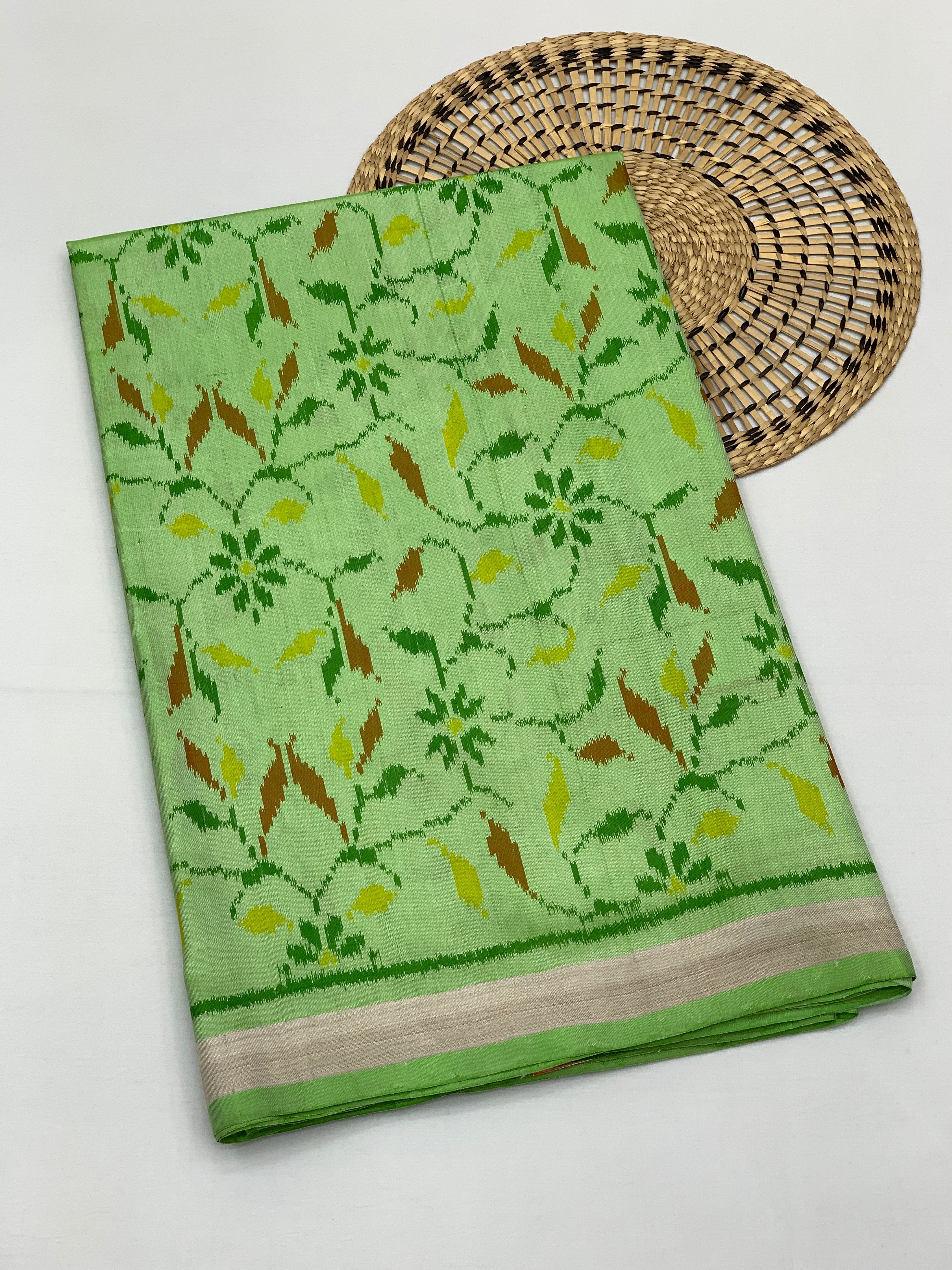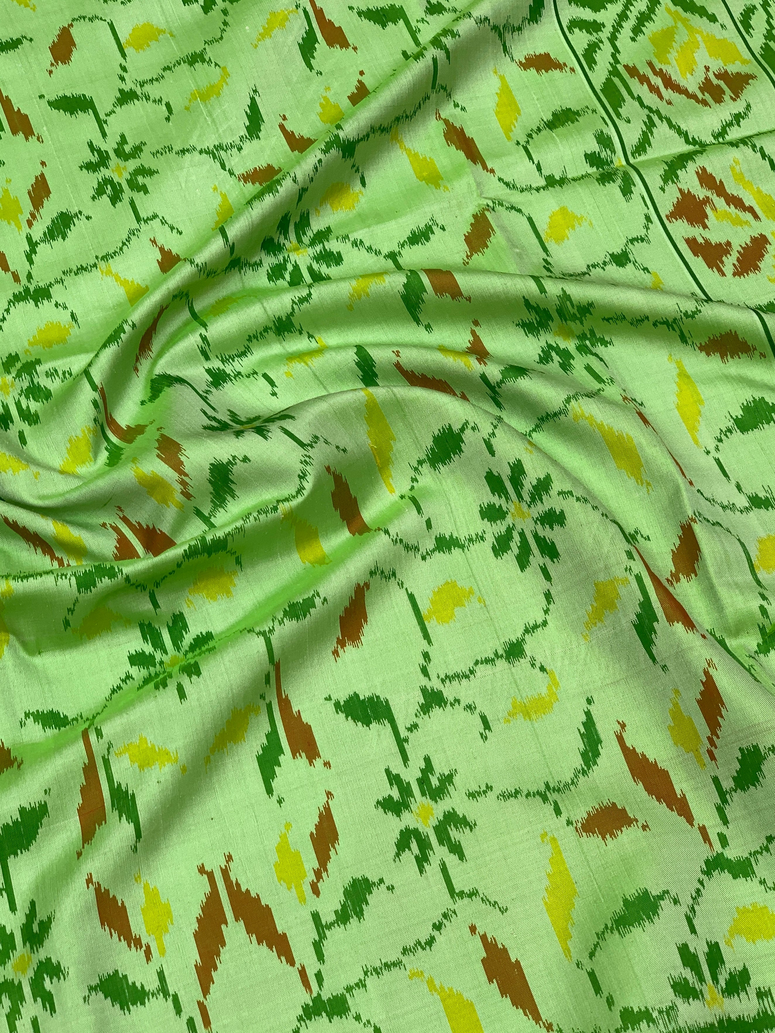 The green Rajkot Patola saree features an intricate all-over floral and peacock pattern, accentuated by a self zari border and a floral pallu. It includes a coordinating plain blouse with a matching border, completing a sophisticated ensemble.