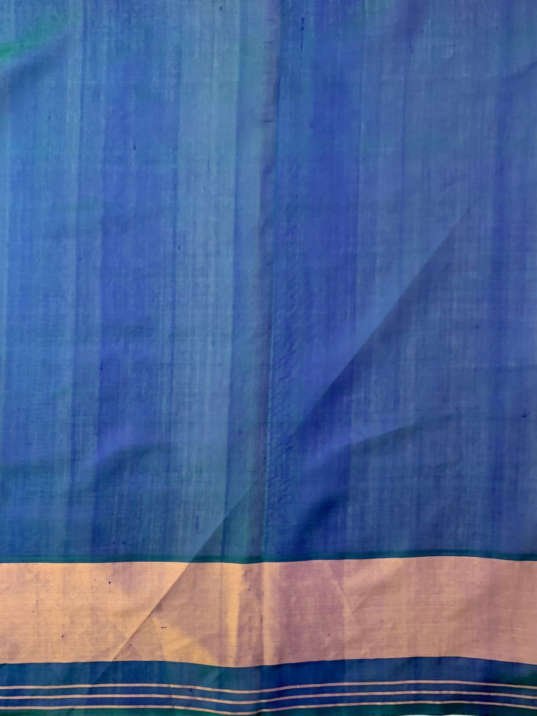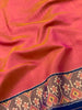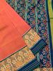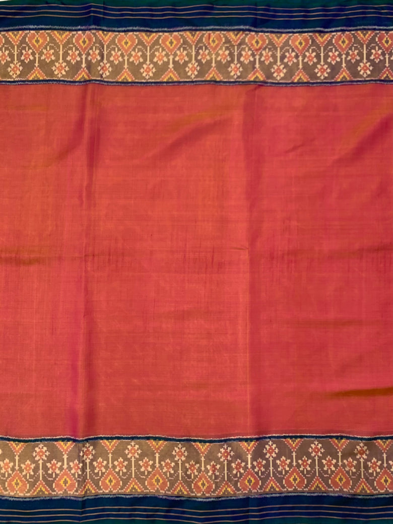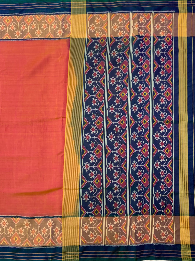 The Rajkot Patola saree boasts a plain pattern throughout, accompanied by a contrasting tissue floral border and pallu in pink and mustard hues. Additionally, the blouse showcases a contrast between a plain design and a zari border.