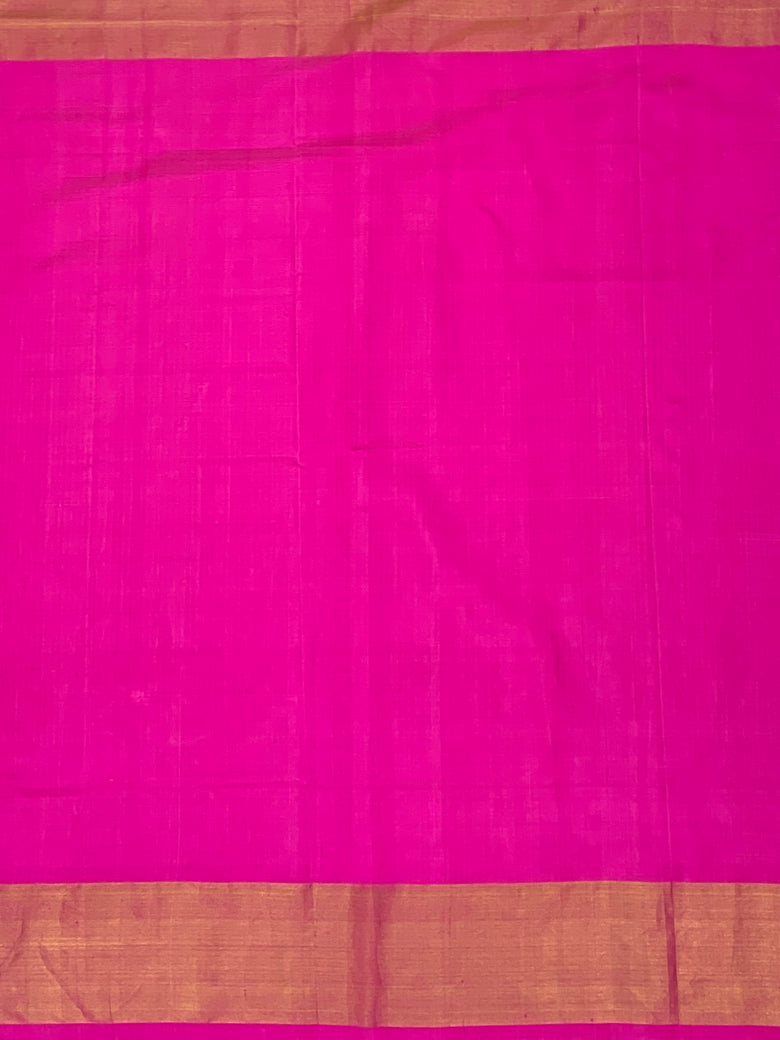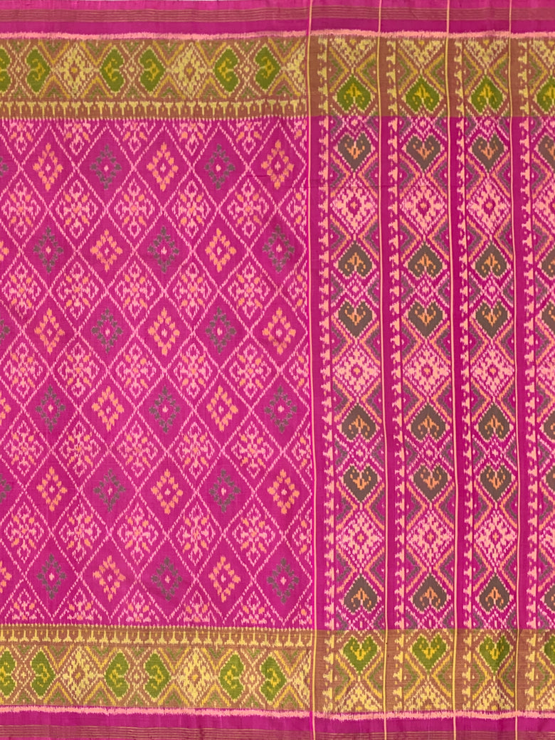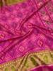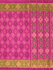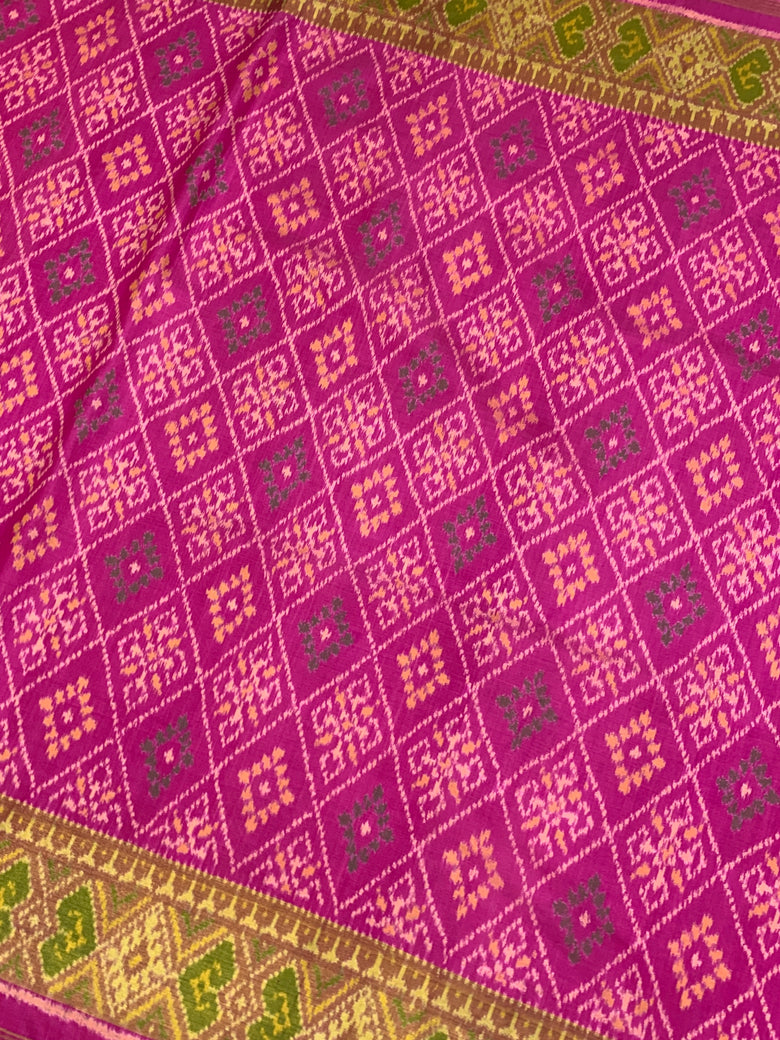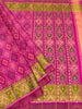 This Rajkot Patola saree in vibrant pink showcases a detailed geometrical pattern harmoniously combined with an all-over floral design. Enhanced by a contrasting gold zari floral border and an elegant pallu, The ensemble is completed with a self-plain blouse featuring a subtle kaddi border, making it a refined choice for special occasions.