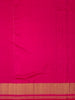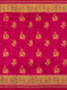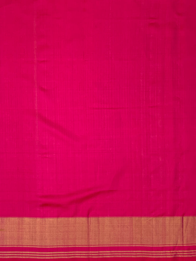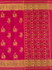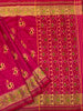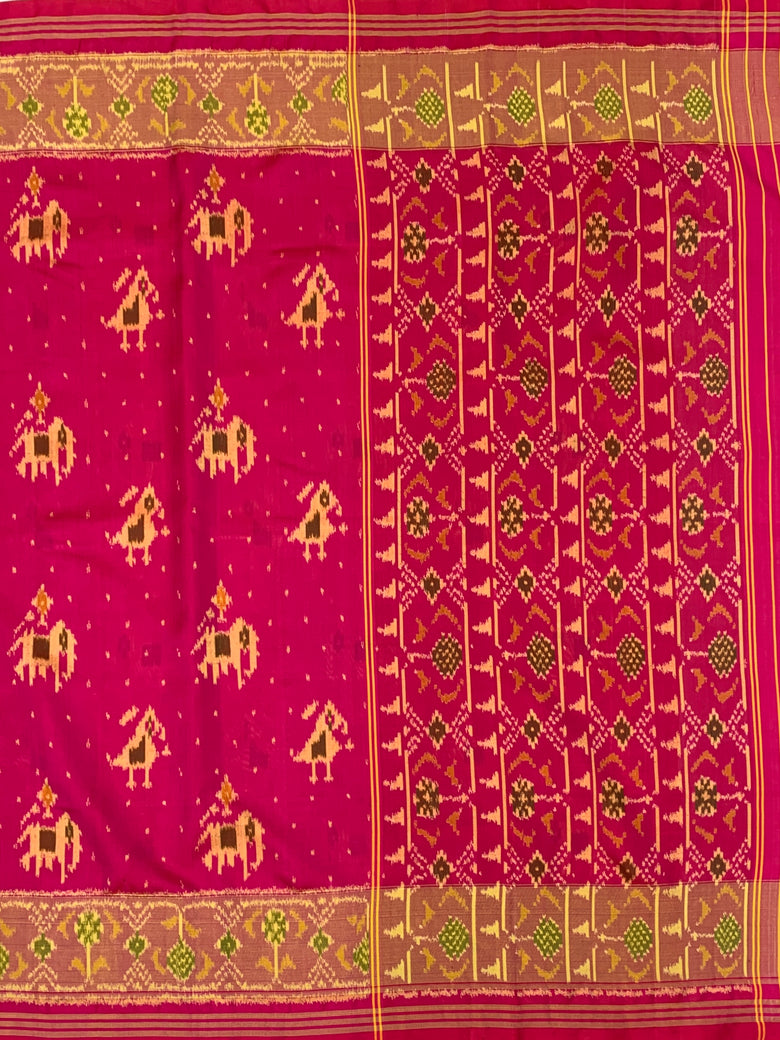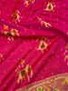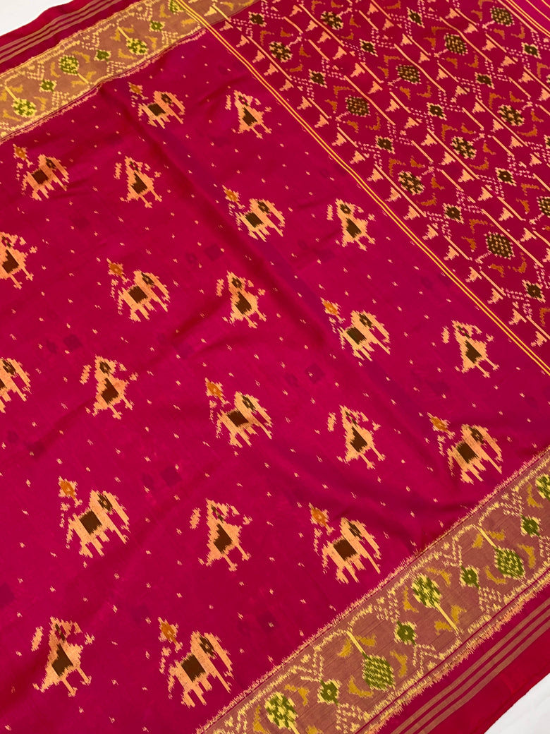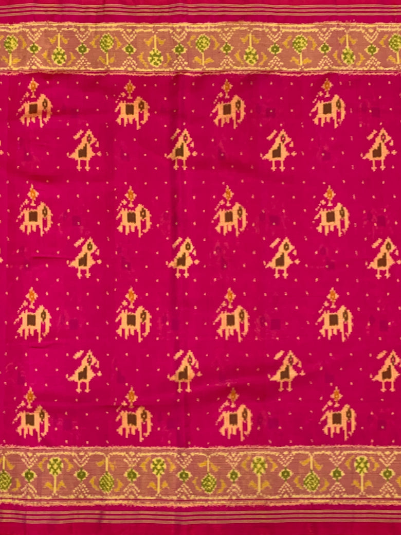 Rajkot patola saree featuring intricate elephant and bird motif buttis woven throughout. It showcases a self-tissue floral border and pallu in a base pink hue with red accents. The blouse is plain with a matching border, complementing the elegant design.