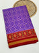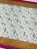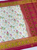 This White Rajkot Patola saree features an intricate floral jaal pattern throughout, accentuated by a contrasting gold zari border and a beautifully designed floral pallu. It is paired with a plain pink blouse that includes a matching border.