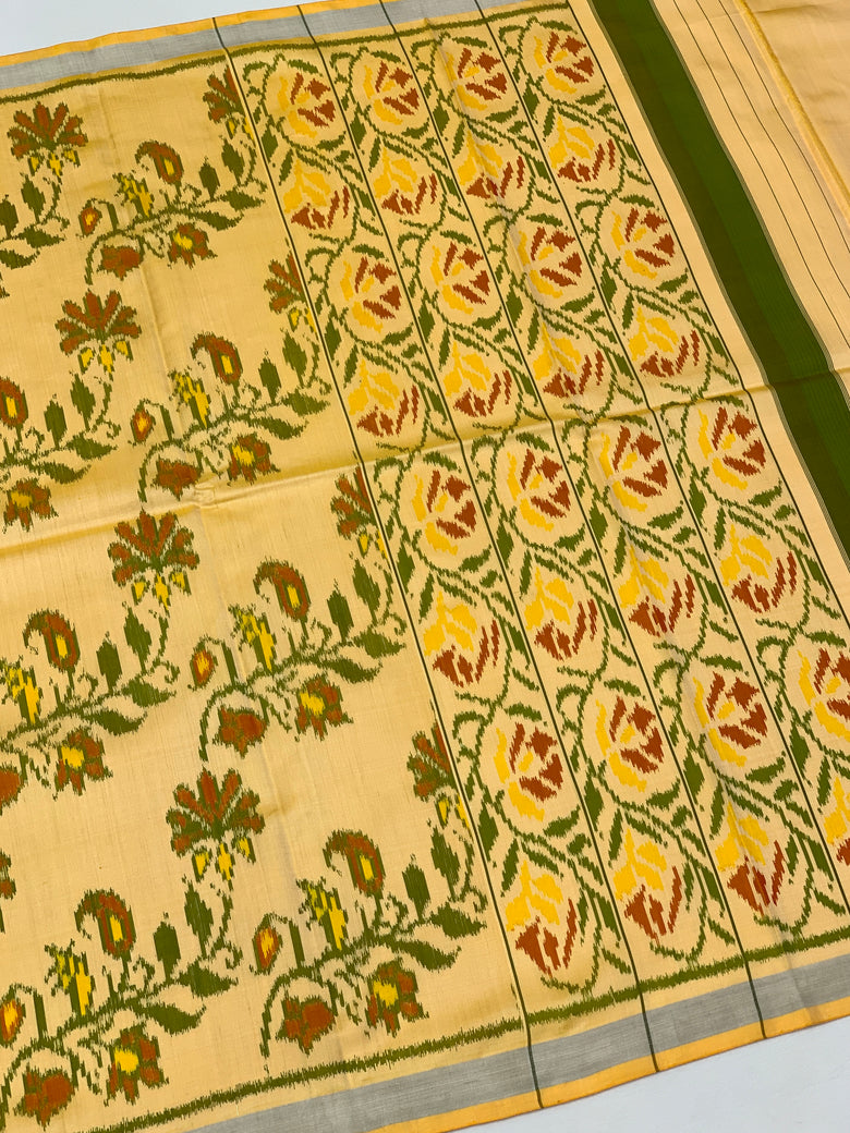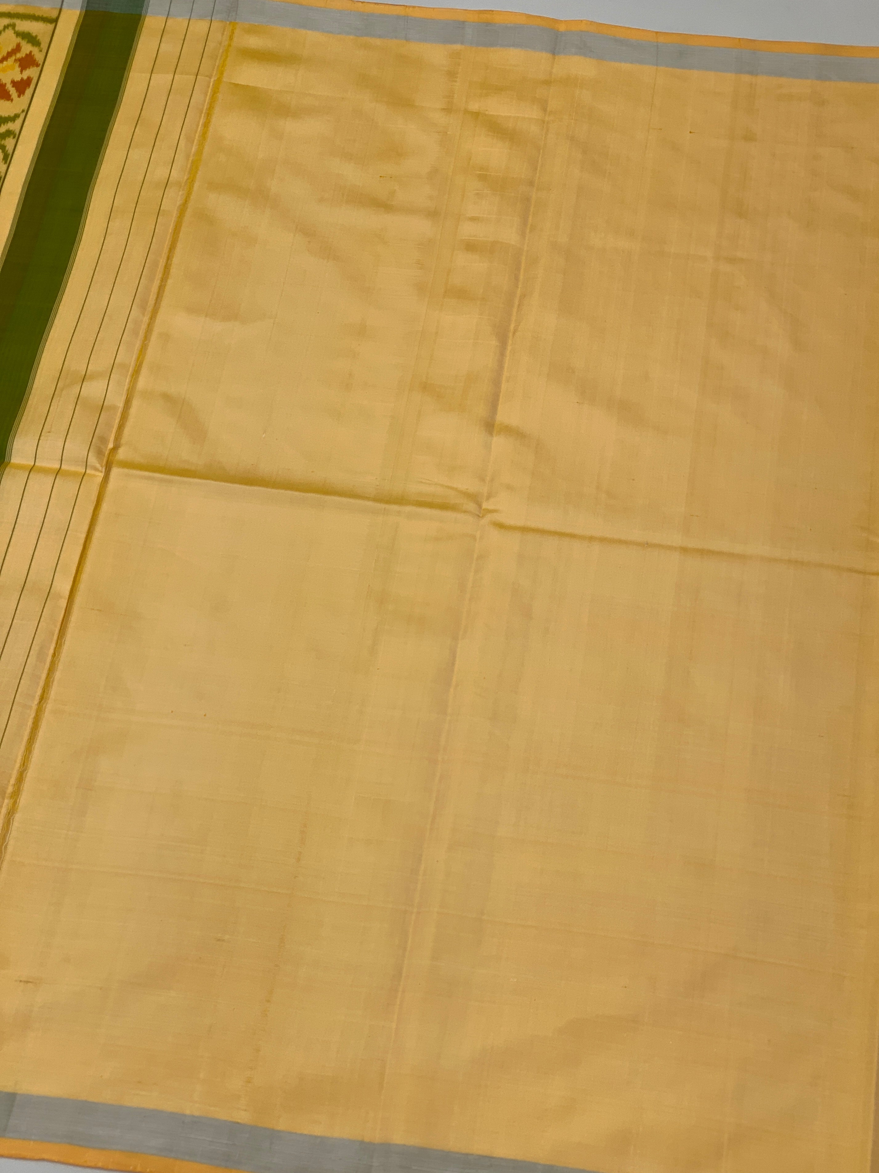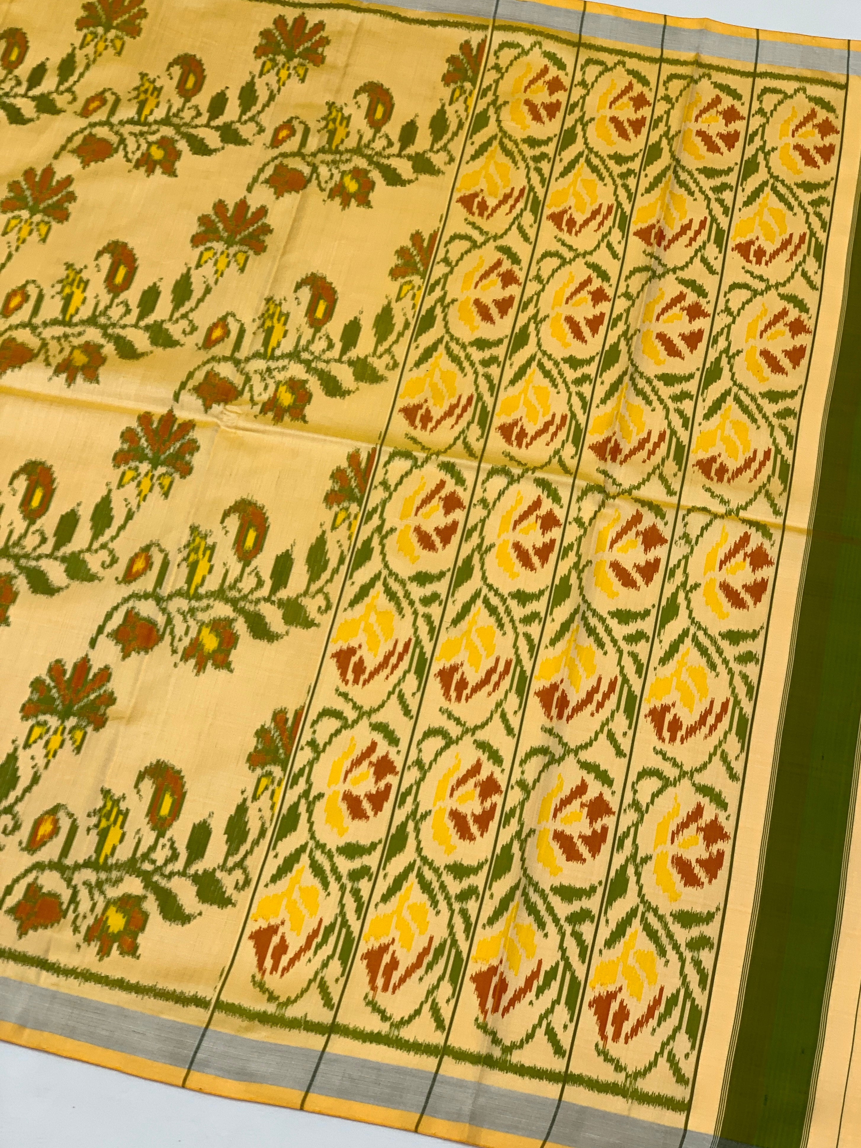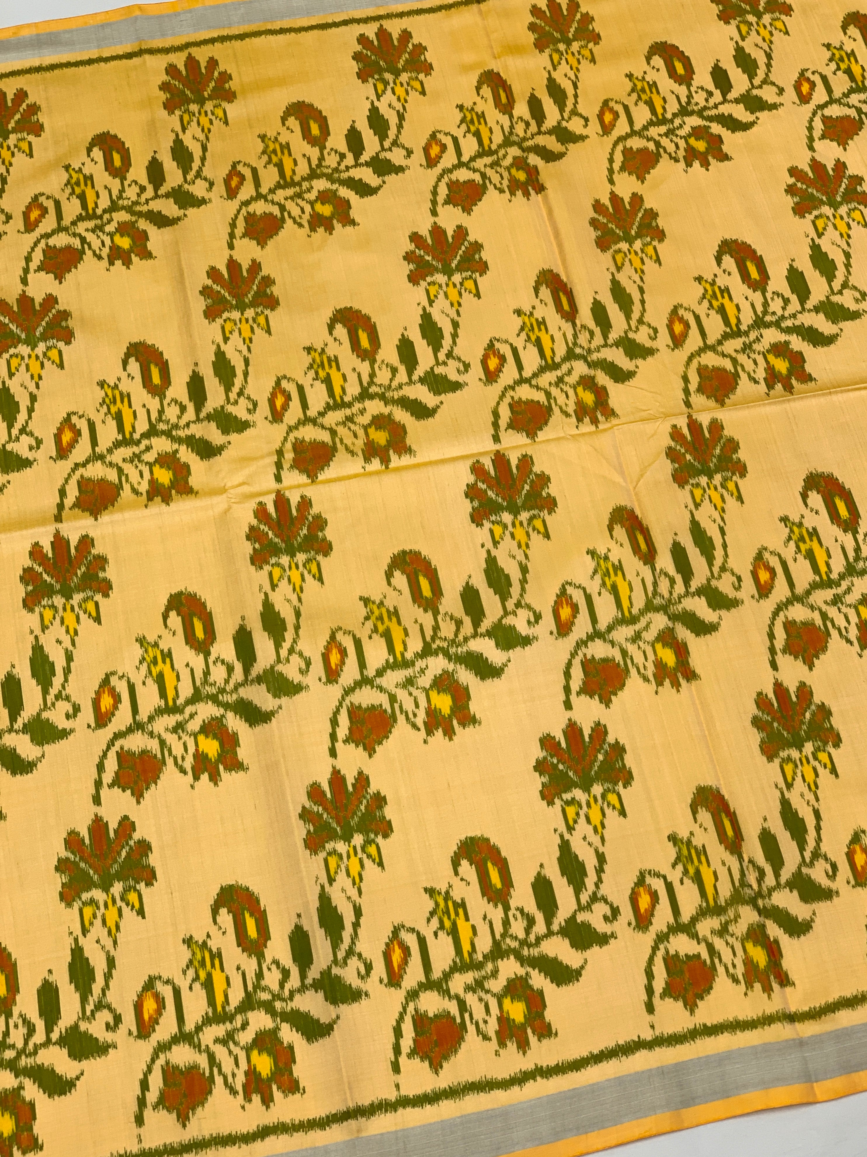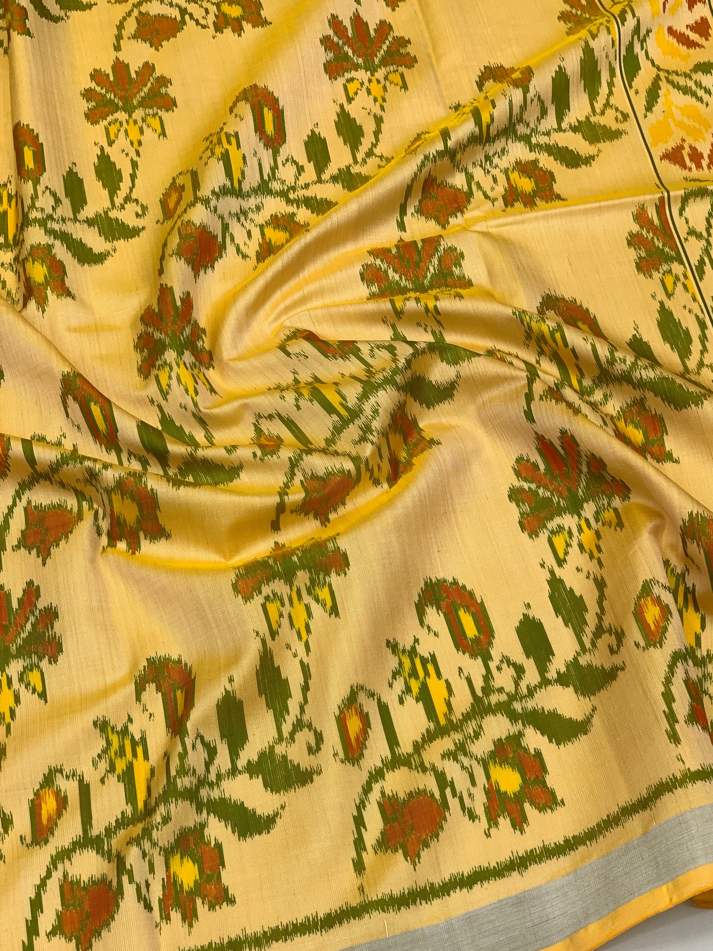 This Rajkot Patola saree is crafted with an intricate meenakari floral design across the fabric, enhanced by subtle plain zari borders and a beautifully detailed floral pallu in vibrant butter yellow. The blouse features a self plain fabric accented with an elegant zari border for a refined finish.