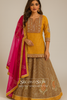 Light-brown Lehenga Set features a silk material with a geometric design adorned with sequence floral patterns and contrast polka buttis. It also includes a sequence embellished neckline and a thread work floral pattern. The border is made of a contrasting kora fabric with a geometric design.
