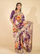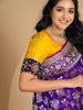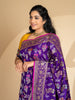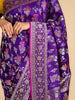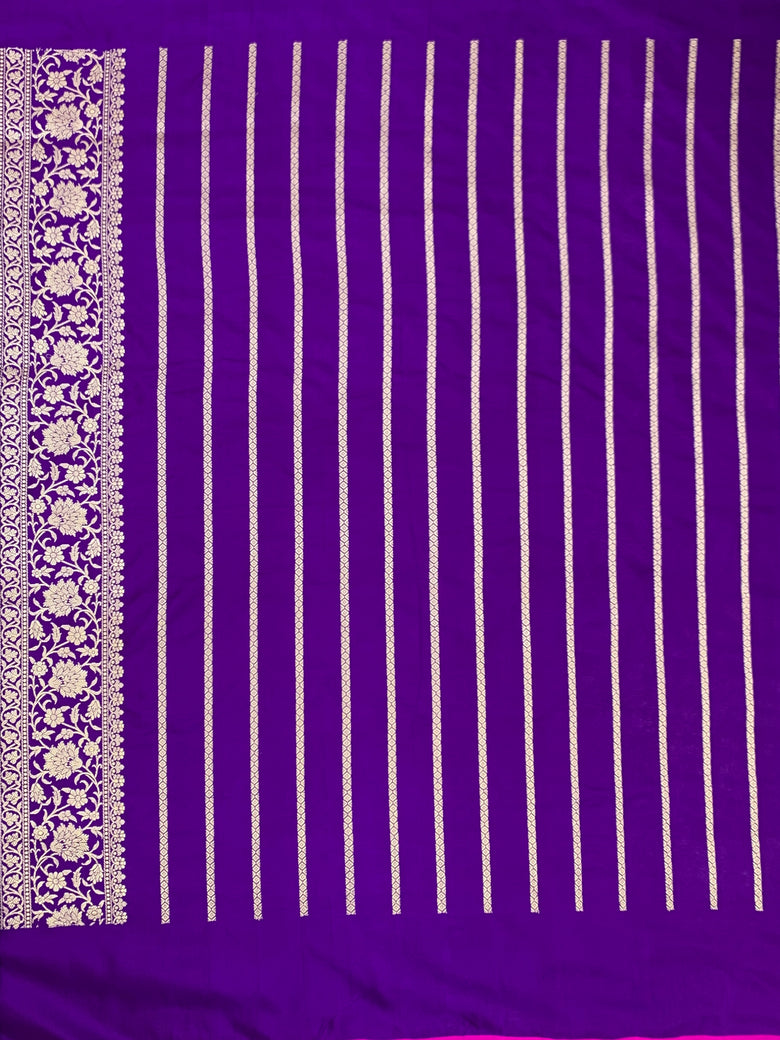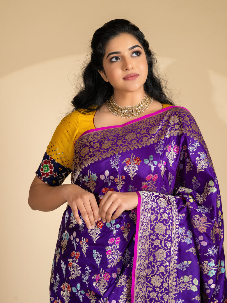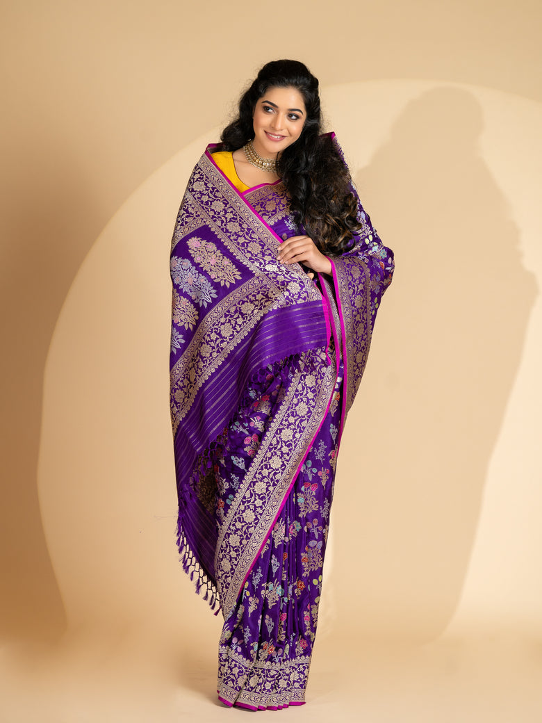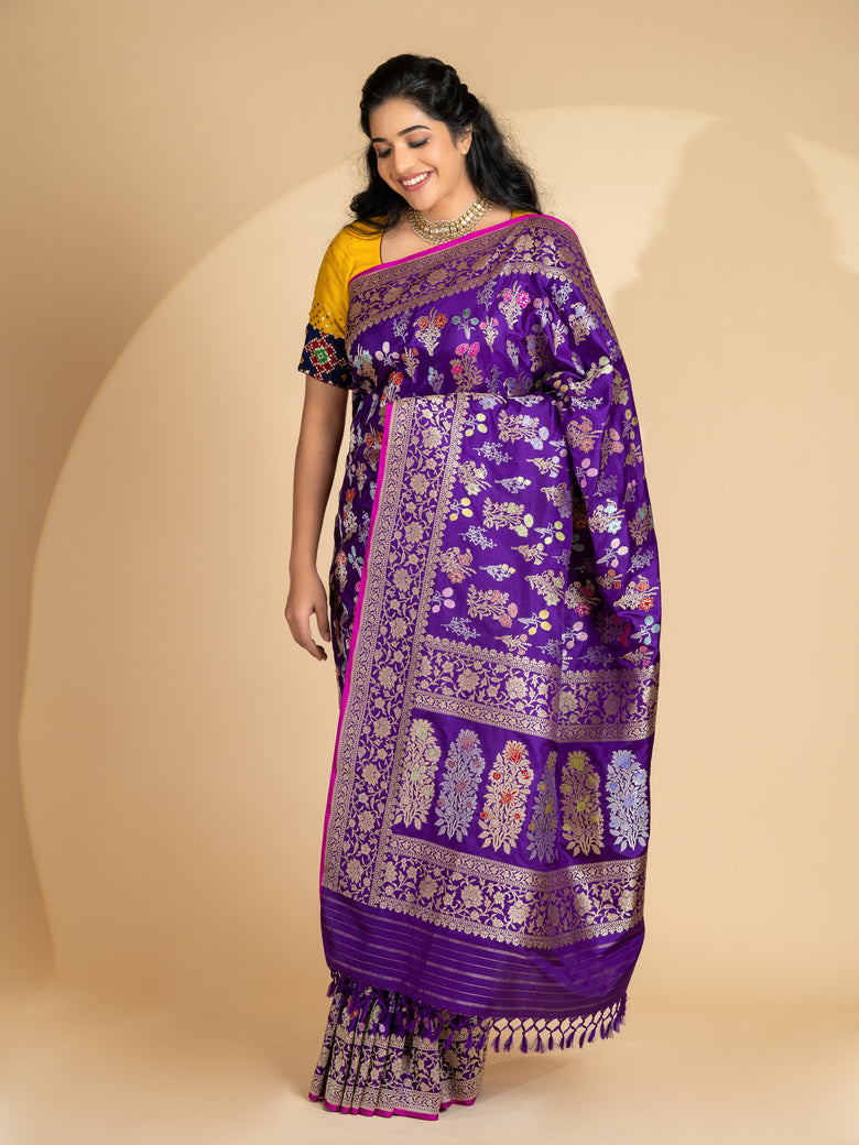Banarasi kadwa weave silk saree boasts intricate gold, silver zari, and meenakari floral buttis woven throughout. The self floral border and pallu add to its overall elegance. In a vibrant shade of purple, this saree also comes with an unstitched blouse featuring self zari stripes with border.