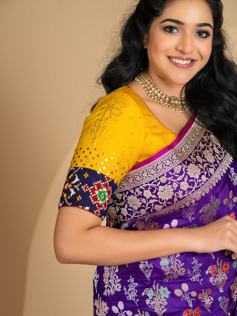 This blouse features a fusion of organza and patan patola sleeves, in a vibrant mango-yellow color. The design is intricately plain, with self badla work and a patan patola border on the sleeves.