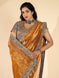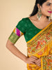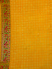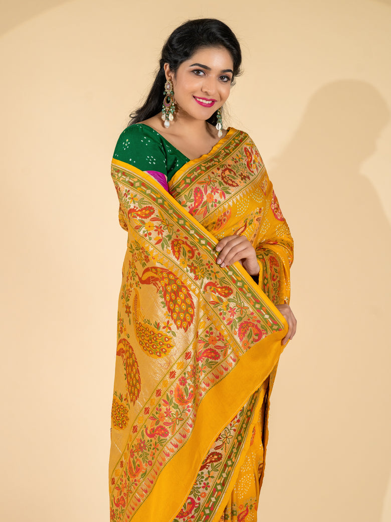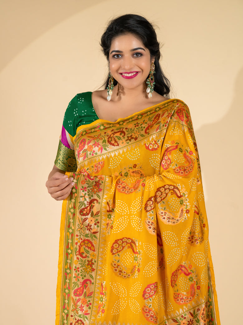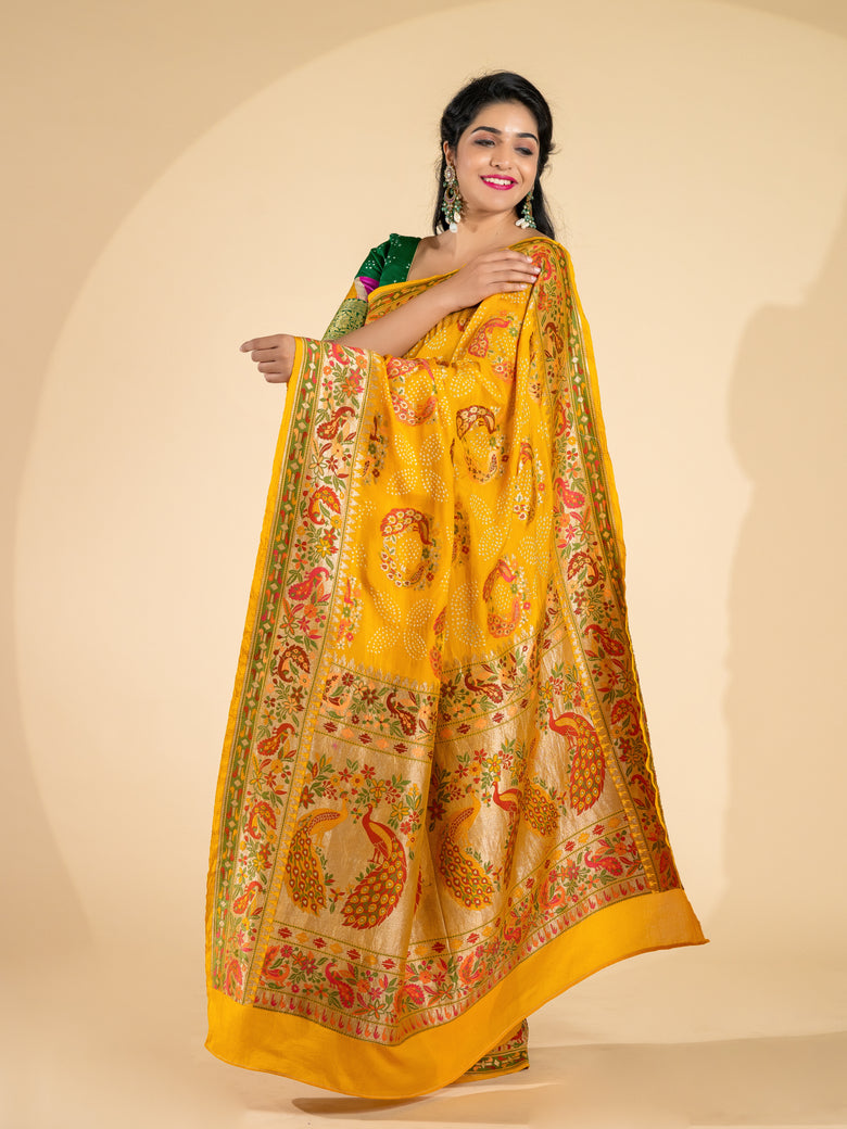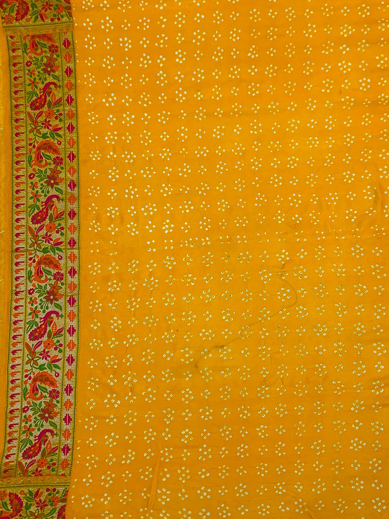 Banarasi tie-dye bandhani saree features an all-over gold zari weave, as well as meenakari floral and peacock motif buttis. The saree also has a self-designed floral and peacock motif meenakari border and pallu, with a mango-yellow color. A contrasting, unstitched blouse with a border is included, along with a self-designed bandhani pattern for the blouse.