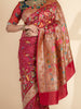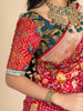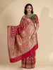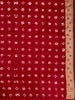 Banarasi tie-dye bandhani saree accentuated with gold zari and meenakari crane bird motifs. The self floral border and pallu add to its elegant look. This saree comes in a red color and includes an unstitched blouse in a matching bandhani design with a border.