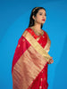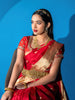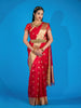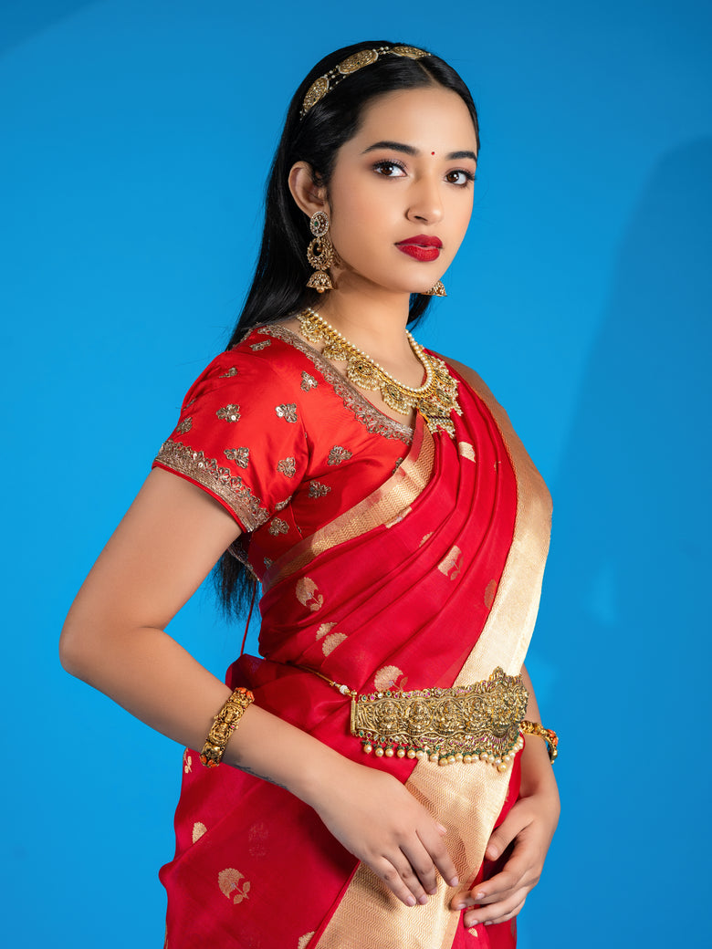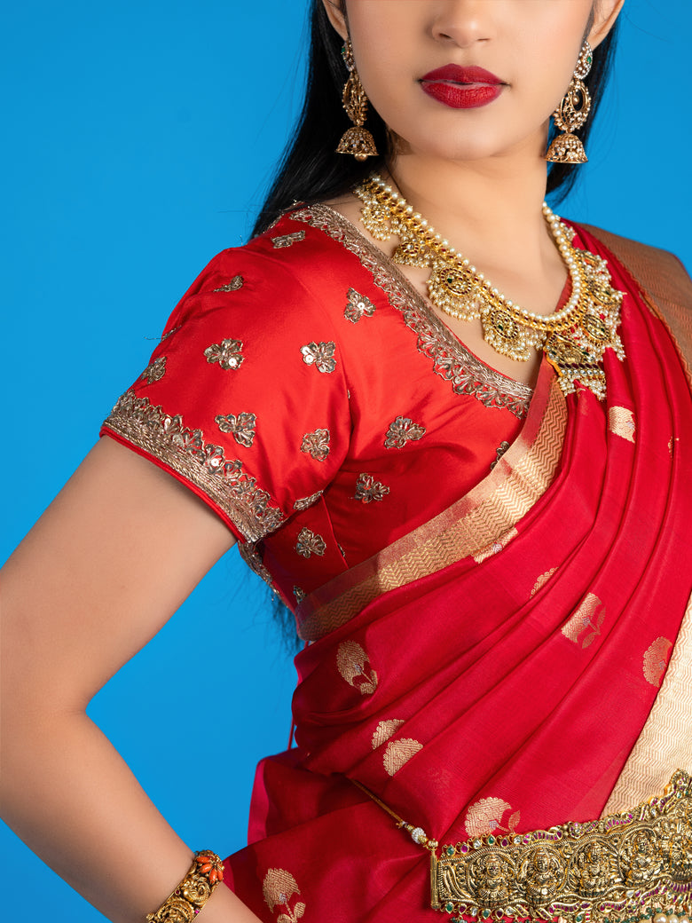 Beautiful red silk blouse featuring intricate floral work and elegant self sleeves.