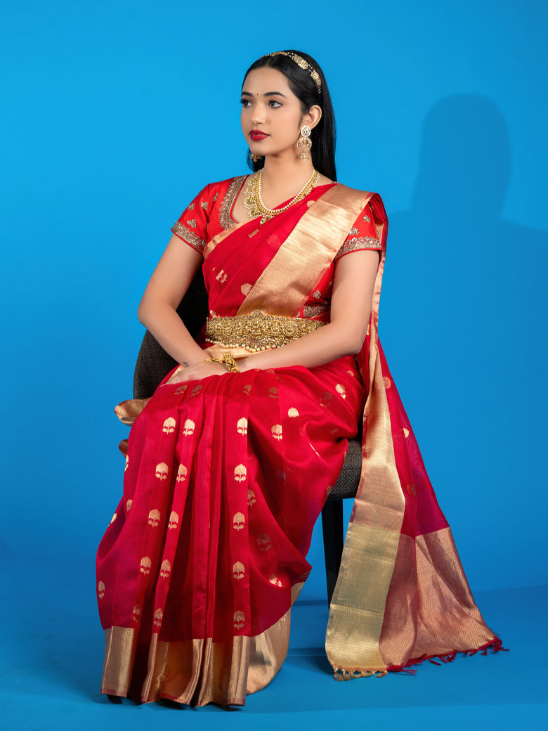 This beautiful chanderi silk saree features an all-over weave of gold and silver zari floral buttis, with a zig-zag pattern border and pallu . You will also receive an unstitched blouse in a self design with a border.