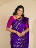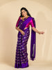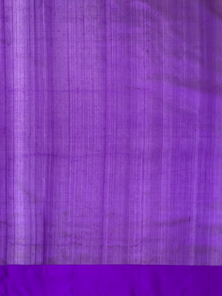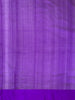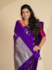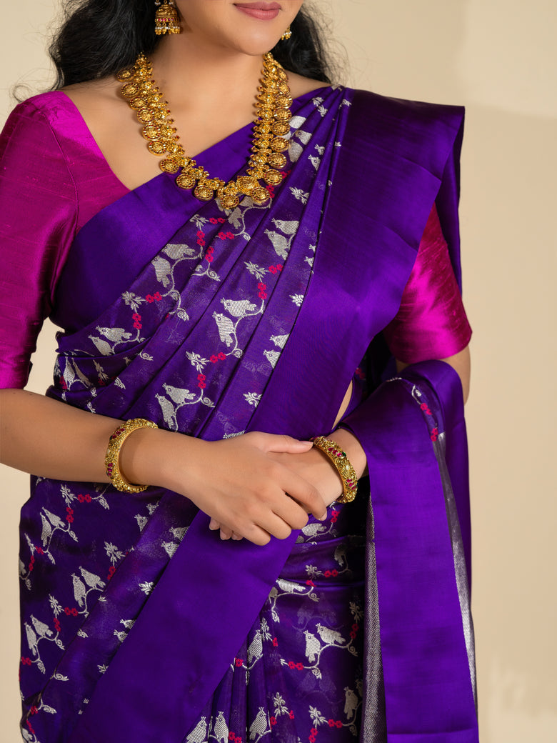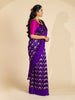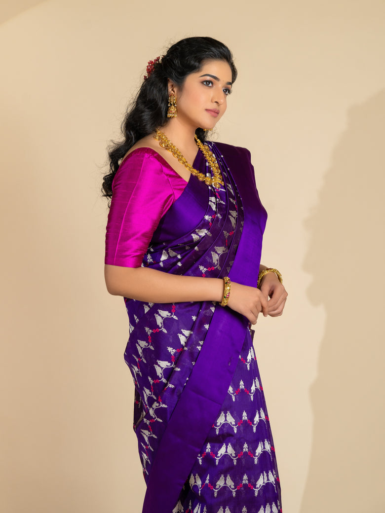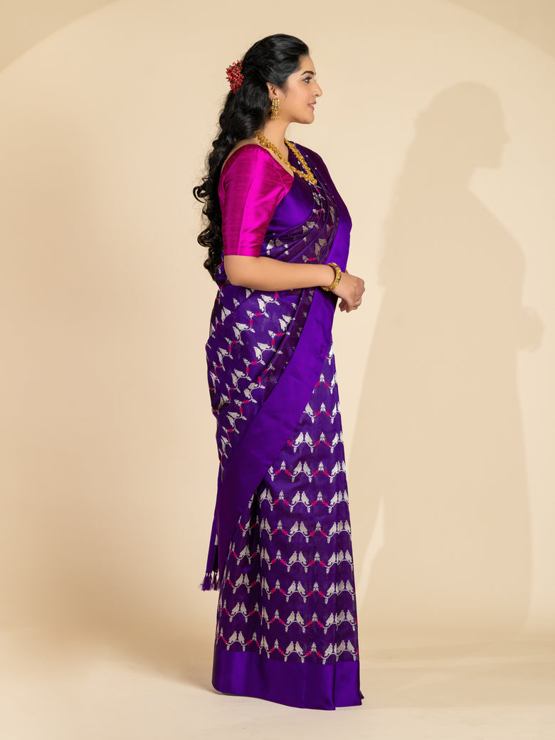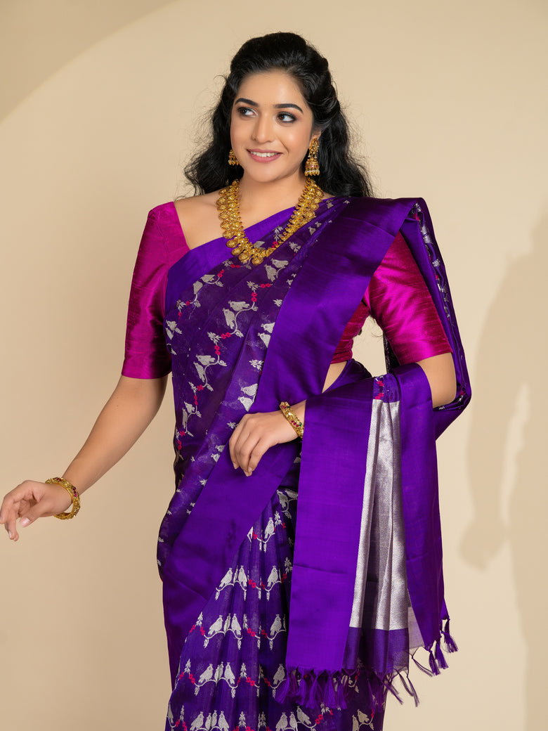 Chanderi silk saree features a delicate weave of silver zari and thread work, with a stunning floral and bird motif . The saree has a self plain border and brocade pallu. The color is a rich purple, and it comes with an unstitched blouse in a simple plain design with border.