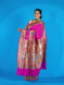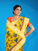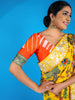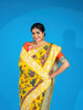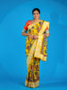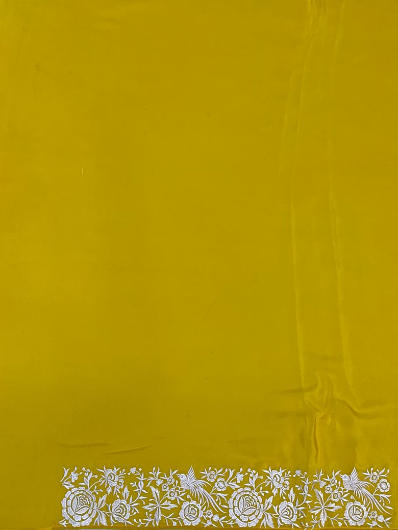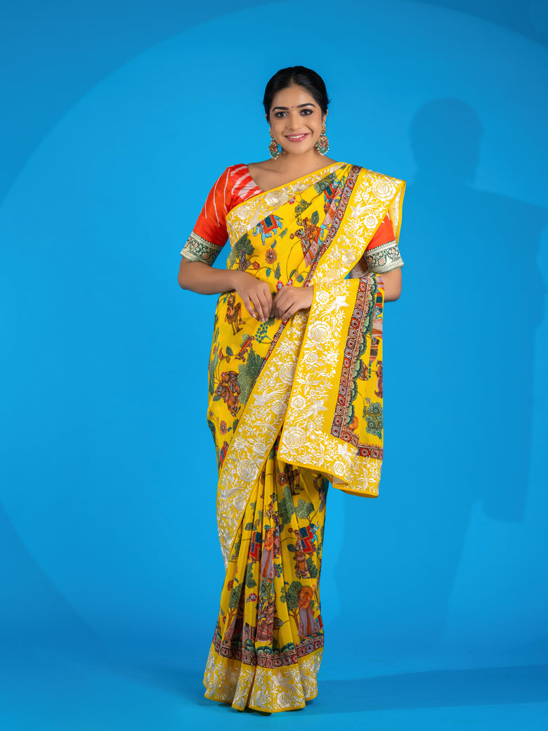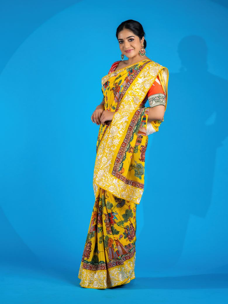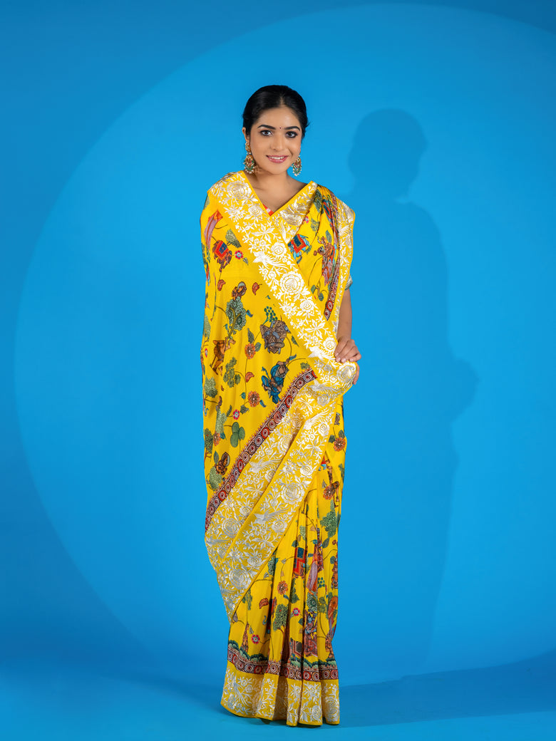 Crepe saree features an exquisite kalamkari print throughout, complemented by a border and pallu embroidered with a floral and bird motif. Its vibrant yellow hue enhances its charm, and the accompanying unstitched blouse boasts a simple yet elegant design with a border.