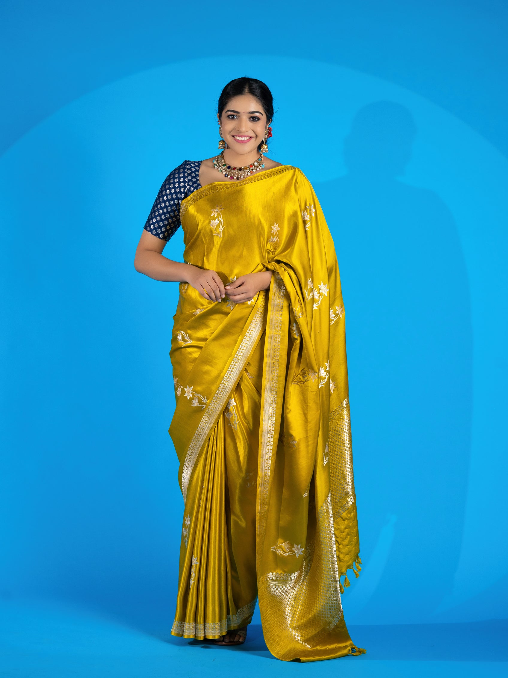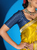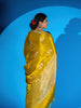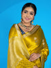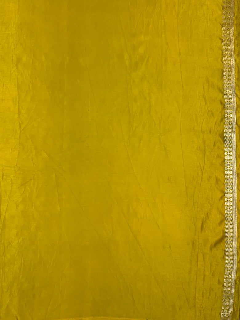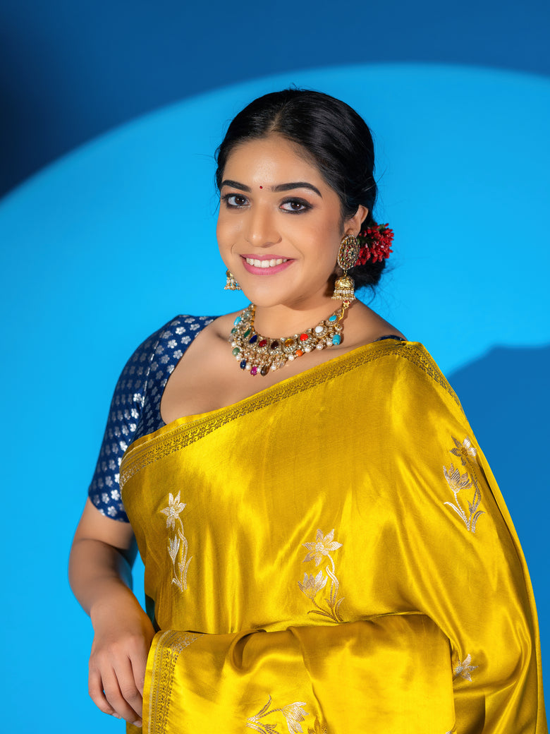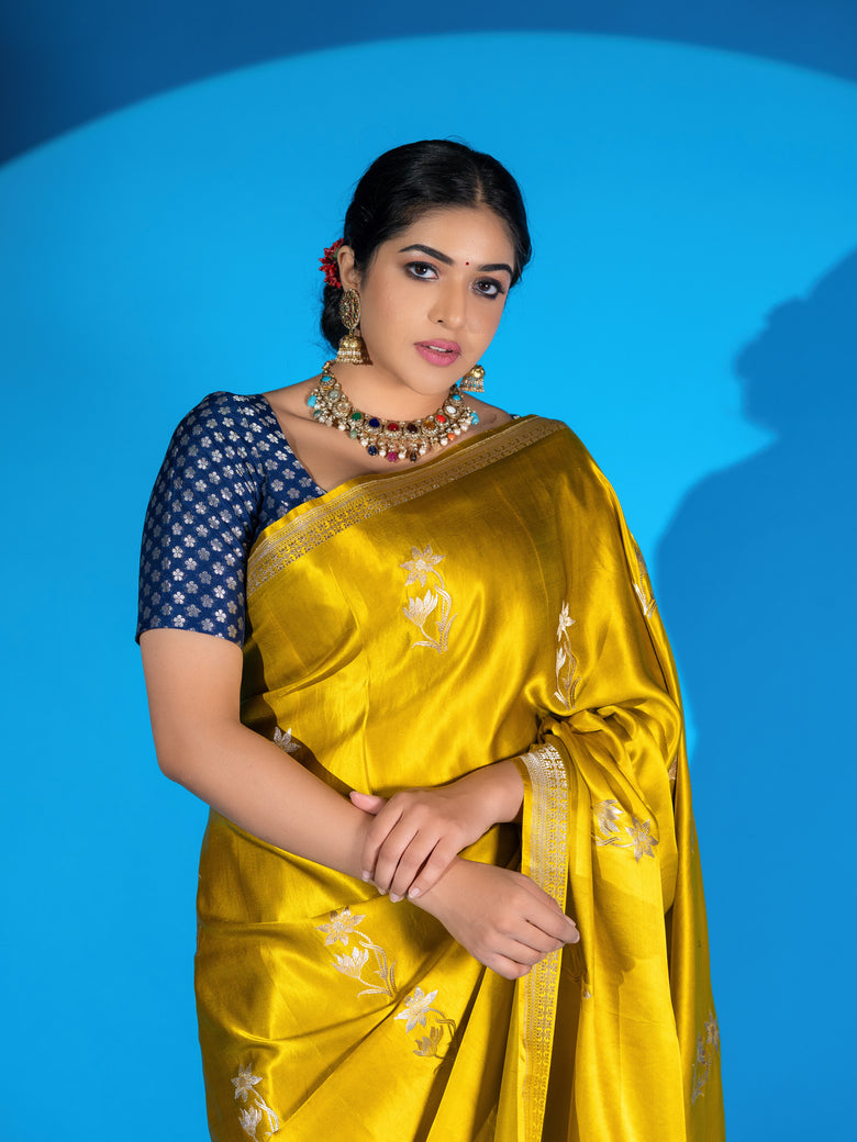 This mashru silk saree features a stunning weave of gold and silver zari floral buttis. The saree also includes a self floral border and brocade pallu, all in a beautiful mustard color. Plus, you'll receive an unstitched blouse with a simple design and border to complete the look.