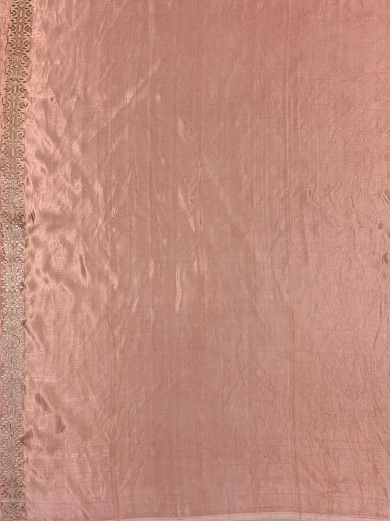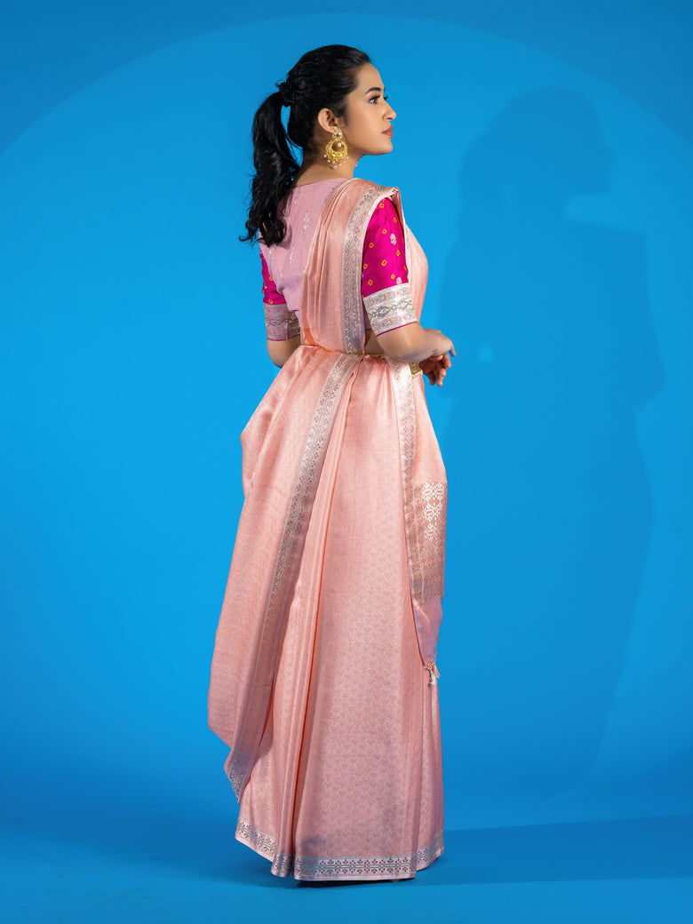 The Mashru Silk Saree in peach features a geometrical design on the entire saree, complemented by a contrasting silver zari floral border and pallu. Included is an unstitched blouse in a complementary design with a border.